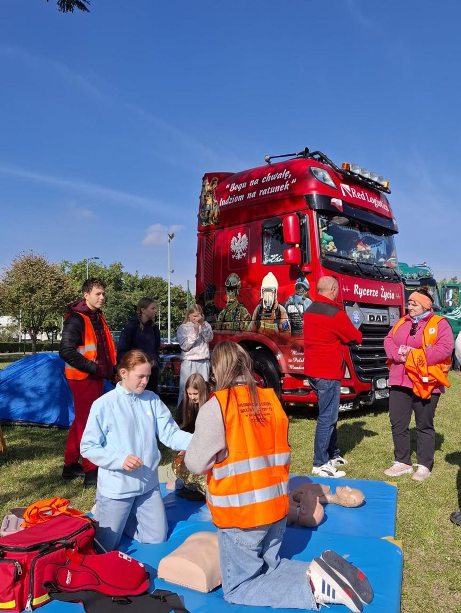 Główną atrakcją dnia okazał się Mini Truck Fest – osiem potężnych ciągników siodłowych zaparkowało na boisku, umożliwiając dzieciom wejście do kabin, wciśnięcie klaksonów i poznanie ogromnych maszyn z bliska. To była prawdziwa motoryzacyjna przygoda, która wzbudziła wielkie emocje i radość. Festyn miał także edukacyjny wymiar. Rycerze Życia prowadzili zajęcia z pierwszej pomocy, podczas których dzieci i dorośli mogli ćwiczyć na fantomach i uczyć się ratowania życia.