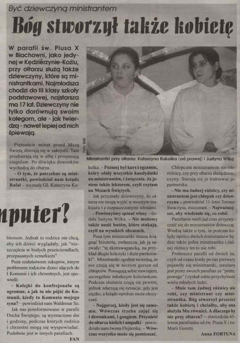 Chłopcom ministrantom nie robi różnicy, czy przy ołtarzu służą dziewczyny. Starają się je traktować po partnersku. - Nie ma żadnej różnicy, czy ministrantem jest chłopak czy dziewczyna - powiedział 11-letni Tomasz Swaczyna, ministrant. - Najważniejsze, aby wiedziało się, co robić. Parafianie mieli już czas przyzwyczaić się do ministrantów dziewcząt. Wiedzą także o tym, że podczas kolędy oprócz dwóch ministrantów będzie także jedna ministrantka i żadnej różnicy im to nie robi. Proboszcz parafii od dwóch lat, czyli od czasu kiedy po raz pierwszy pojawiły się ministrantki, uważany jest przez swoich parafian za “postępowego” i zyskał sobie przychylność wielu młodych ludzi. - Mnie tam żadnej różnicy nie robi, czy ministrant czy ministrantka. Bóg stworzył przecież także kobietę i chciałby, aby ona służyła Mu również. A dlaczego by nie przy ołtarzu? - stwierdziła 65-letnia parafianka od św. Piusa X i św. Marii Goretti.