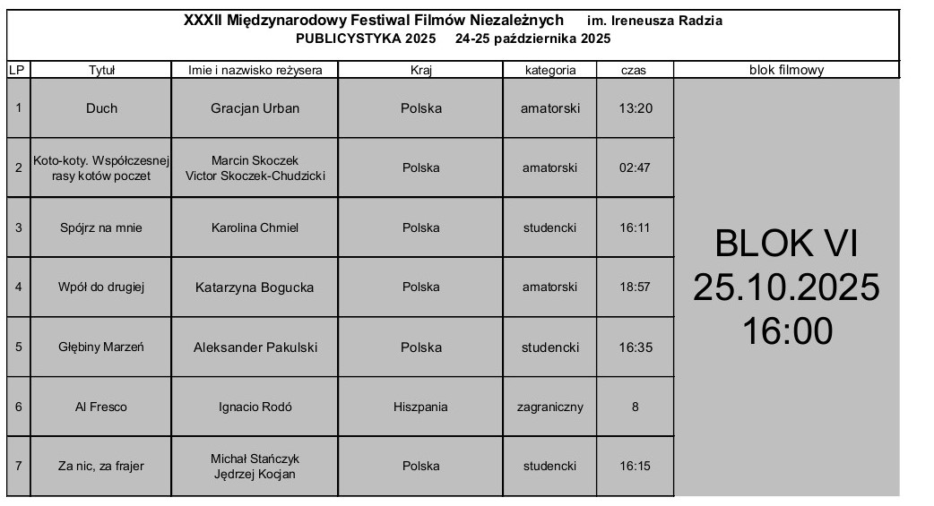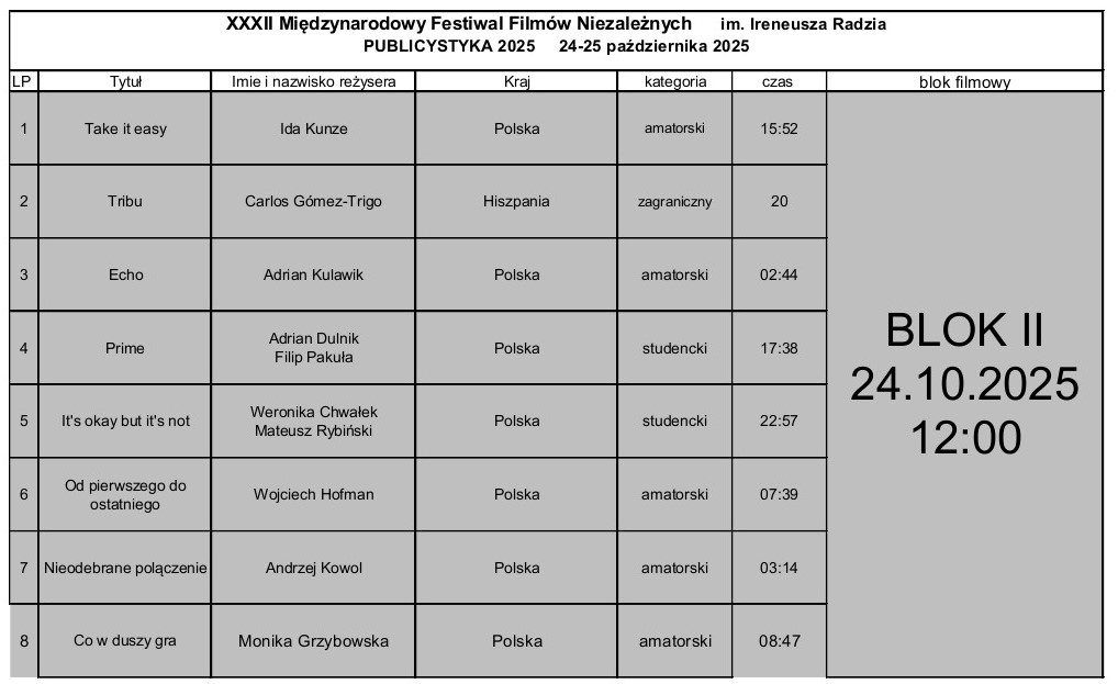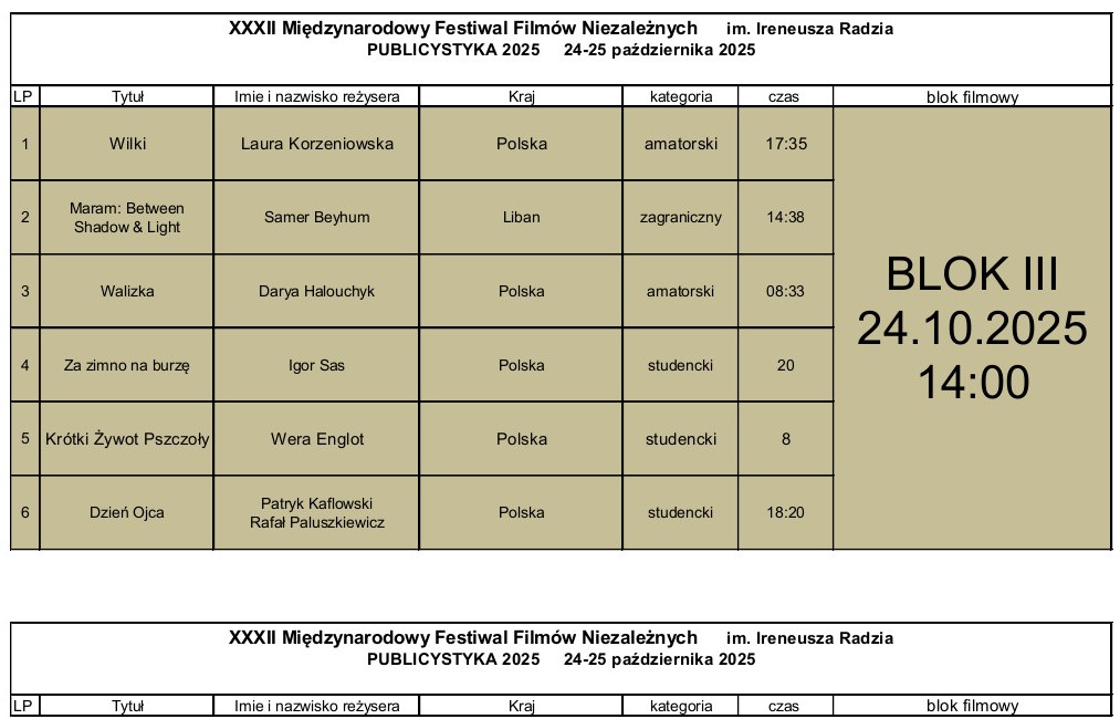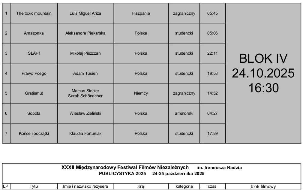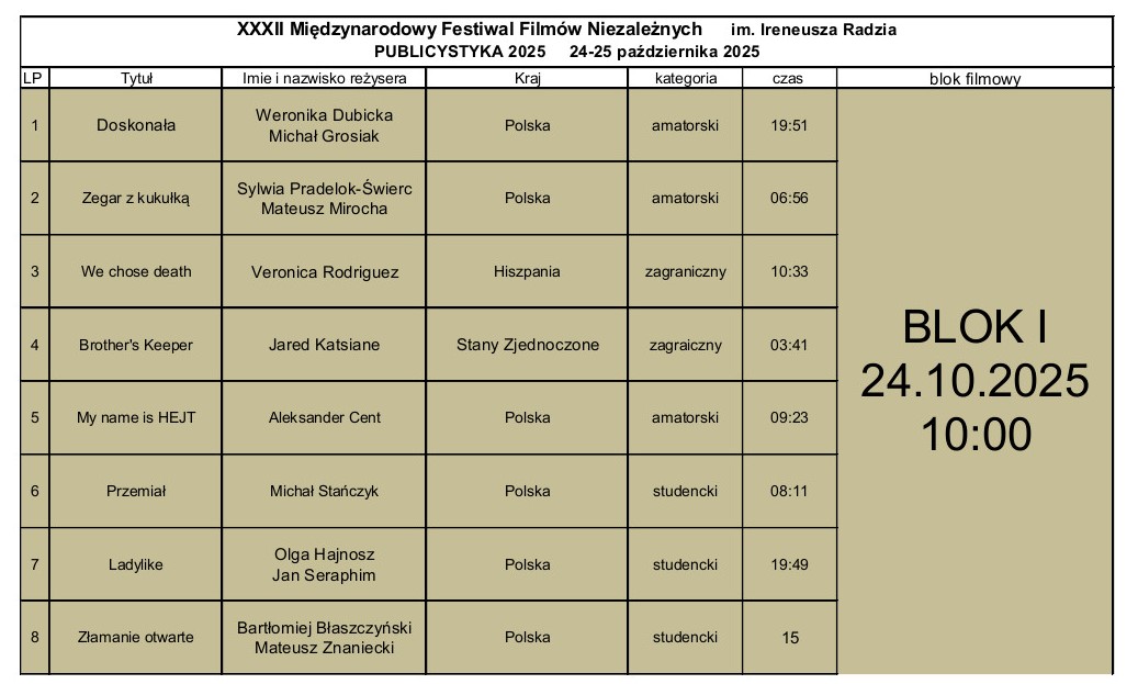 Nieodpłatne projekcje konkursowe w ramach „Publicystyki 2025” zaplanowano na piątek (24.10) od godz. 9.00 w DK "Koźle" oraz na sobotę (25.10) od godz. 14.00 także w DK "Koźle"