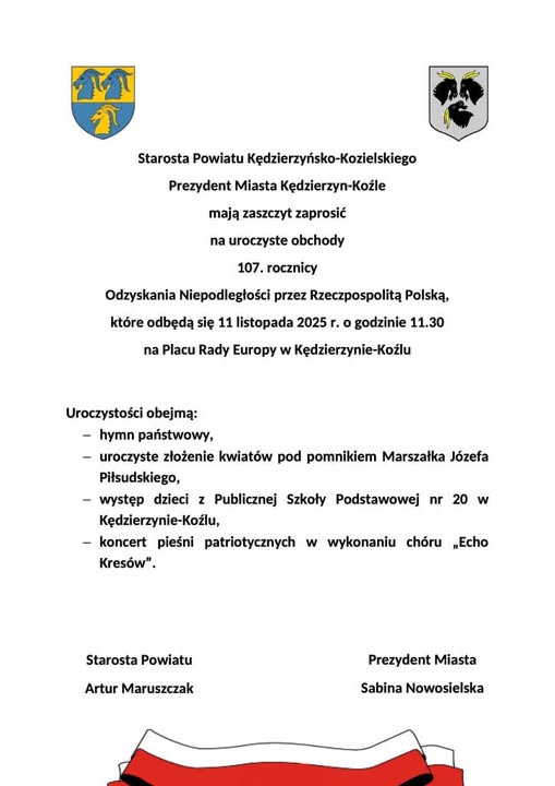 Uroczystości odbędą się w najbliższy wtorek 11.11.2025r o godzinie 11.30 na Placu Rady Europy w Kędzierzynie-Koźlu.