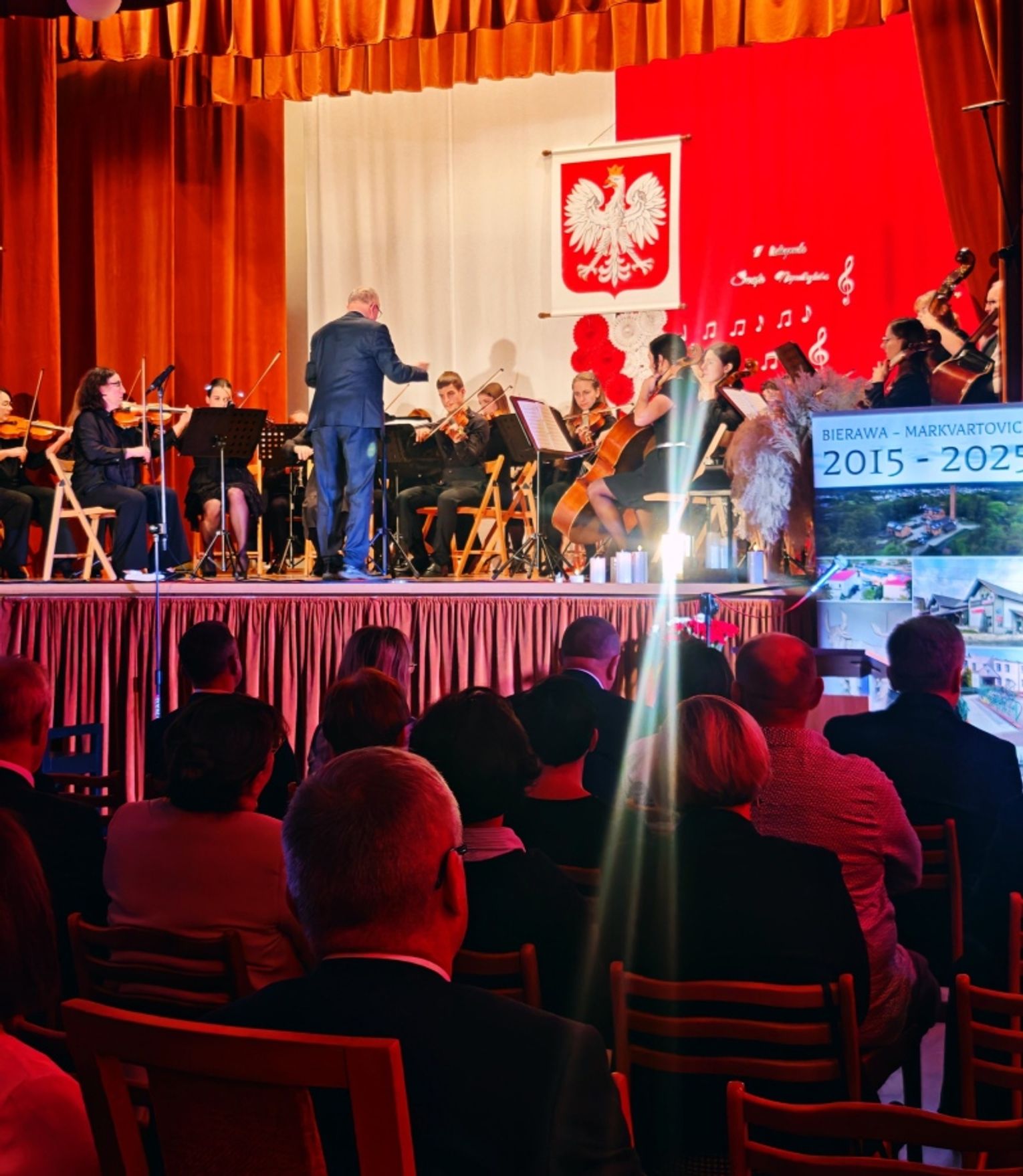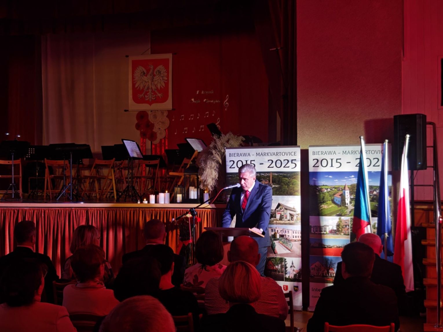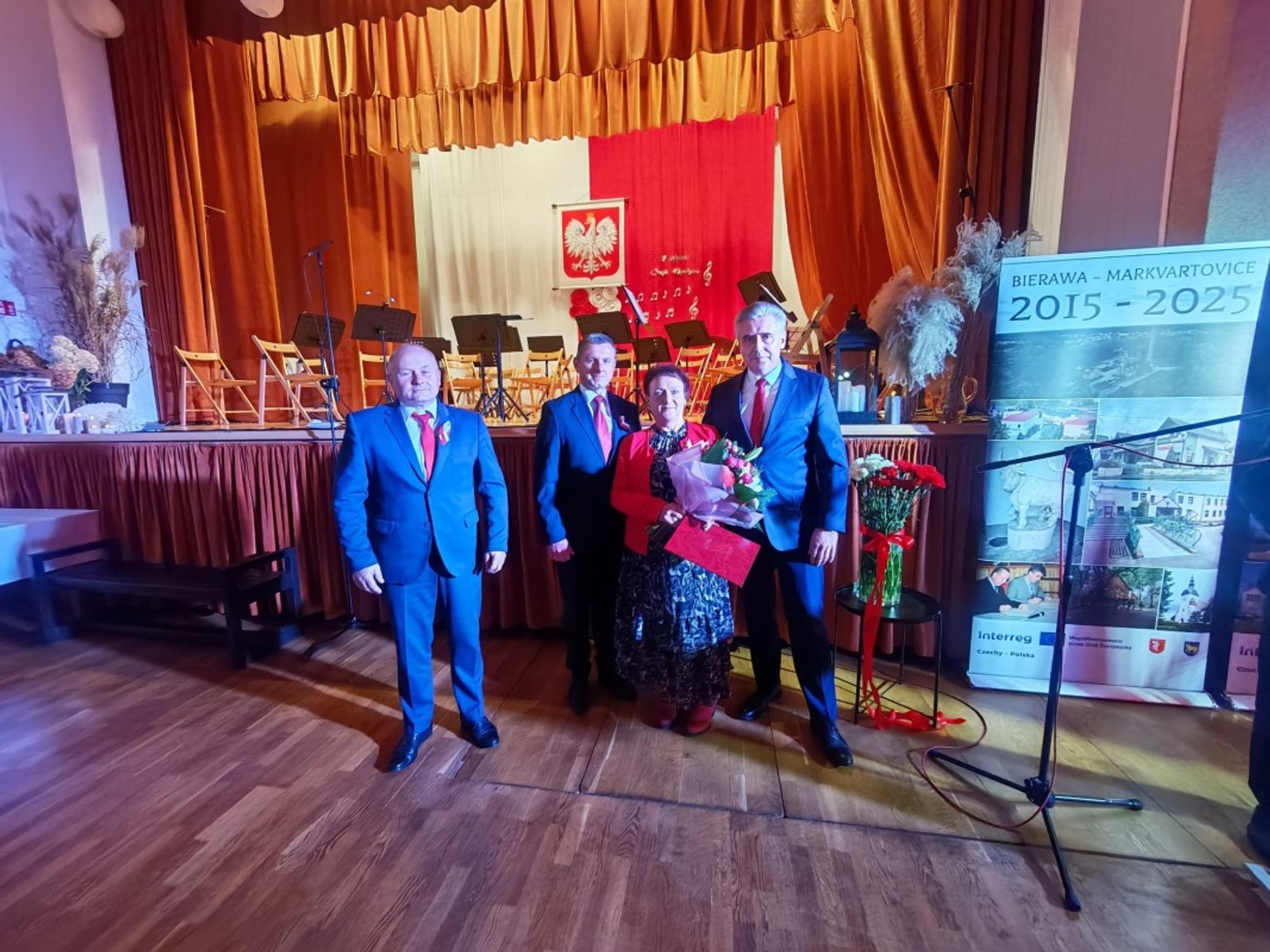Szczególnym akcentem wieczoru było uczczenie 10-lecia partnerstwa gminy Bierawa z czeską gminą Markvartovice. Na scenie pojawili się przedstawiciele zaprzyjaźnionej gminy, ich przemówienia przypomniały o dekadzie wspólnych działań, projektów i spotkań. Jubileuszowe obchody dopełniła wystawa fotografii dokumentująca polsko-czeską współpracę, zrealizowana w ramach projektu dofinansowanego z Funduszu Małych Projektów Euroregionu Pradziad (INTERREG Czechy-Polska 2021-2027).