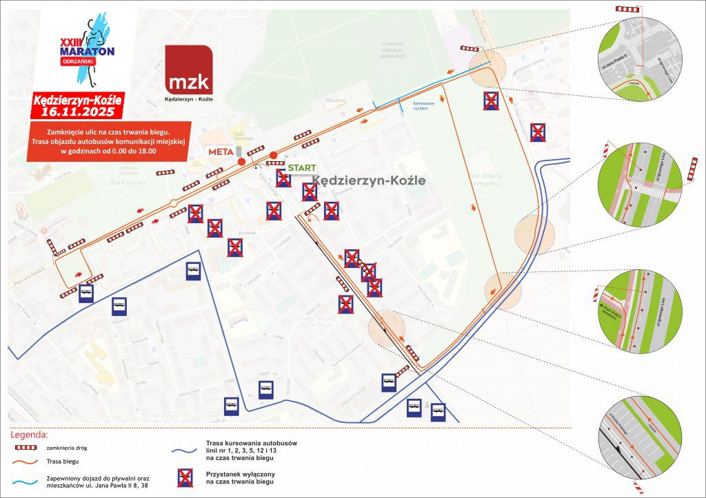 Z powodu imprezy sportowej w niedzielę 16 listopada zamknięty dla ruchu zostanie fragment al. Jana Pawła II od placu Wolności do skrzyżowania z obwodnicą i al. Lisa oraz fragment ul. Wojska Polskiego. W związku z tym w godz. 6.00-18.00 zmianie ulegną trasy przejazdu linii autobusowych MZK nr 1, 2, 3, 5, 12 i 13. Czasowo wyłączone zostaną również przystanki zlokalizowane przy ulicach: 1 Maja (przystanek “Kosmos”), Pionierów, Harcerskiej, Wojska Polskiego, Alei Lisa. Powrót na właściwą trasę przejazdu może nastąpić przed godziną 18.00 jeśli organizator wcześniej dopuści zamknięte odcinki do ponownego użytkowania.