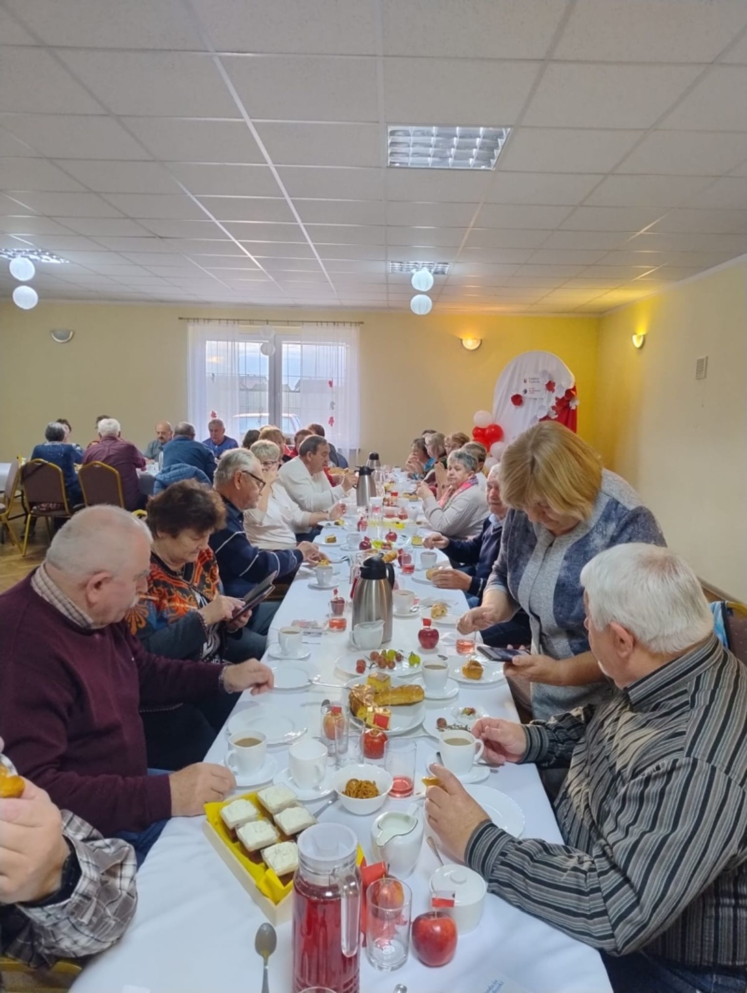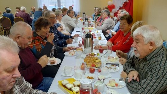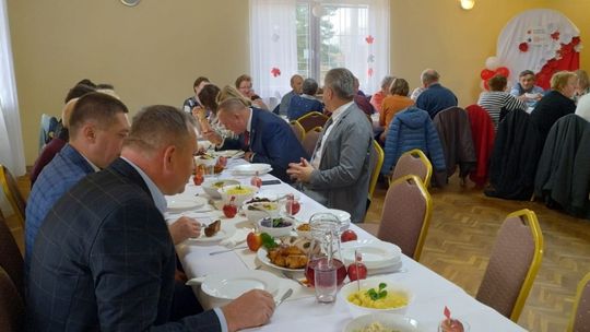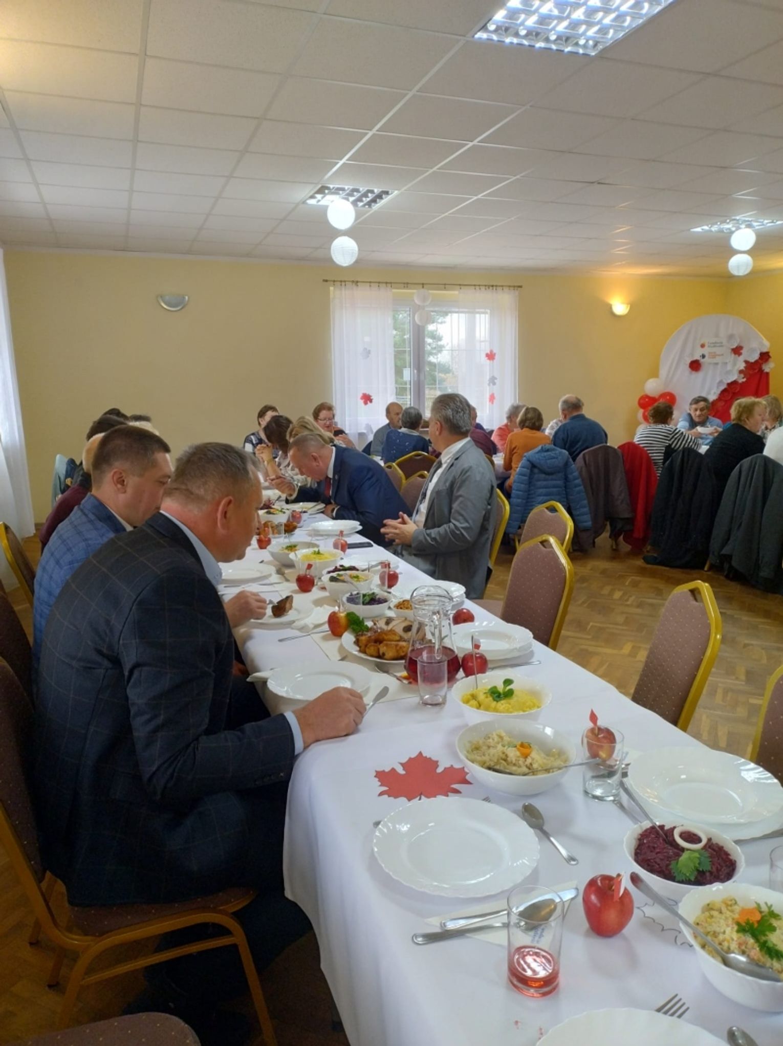 Na stołach pojawiły się klasyczne dania: rosół z domowym makaronem, przygotowanym przez panie ze świetlicy, pieczona kaczka, roladki drobiowe oraz schab zapiekany z wędzoną śliwką. Całość uzupełniały ziemniaki, sos żurawinowy i zestaw trzech surówek. Do napojów podano słodki poczęstunek: tort z okazji jubileuszowego spotkania, sernik, rogaliki oraz owoce w galaretce z bitą śmietaną - wszystko utrzymane w narodowej kolorystyce.