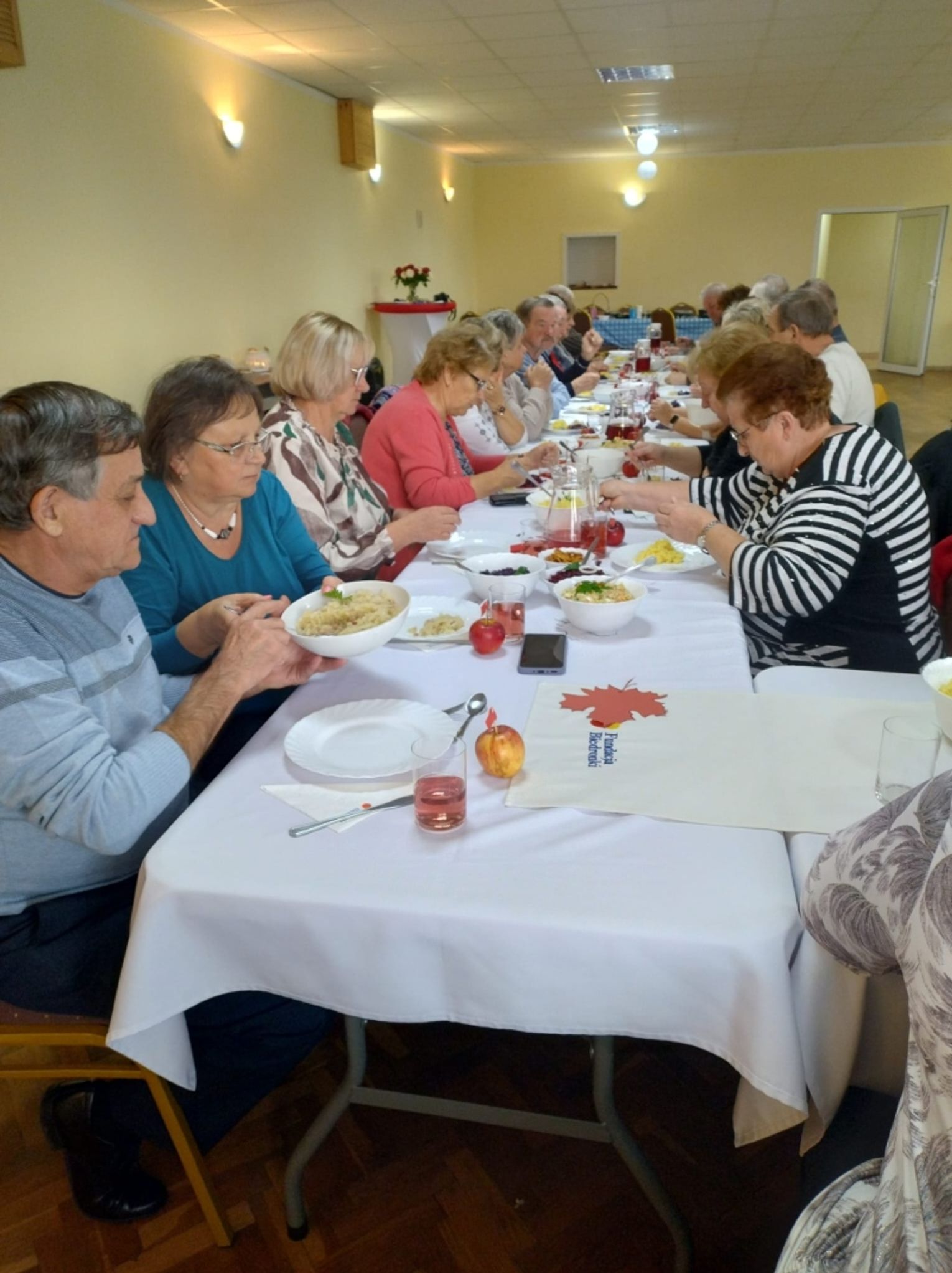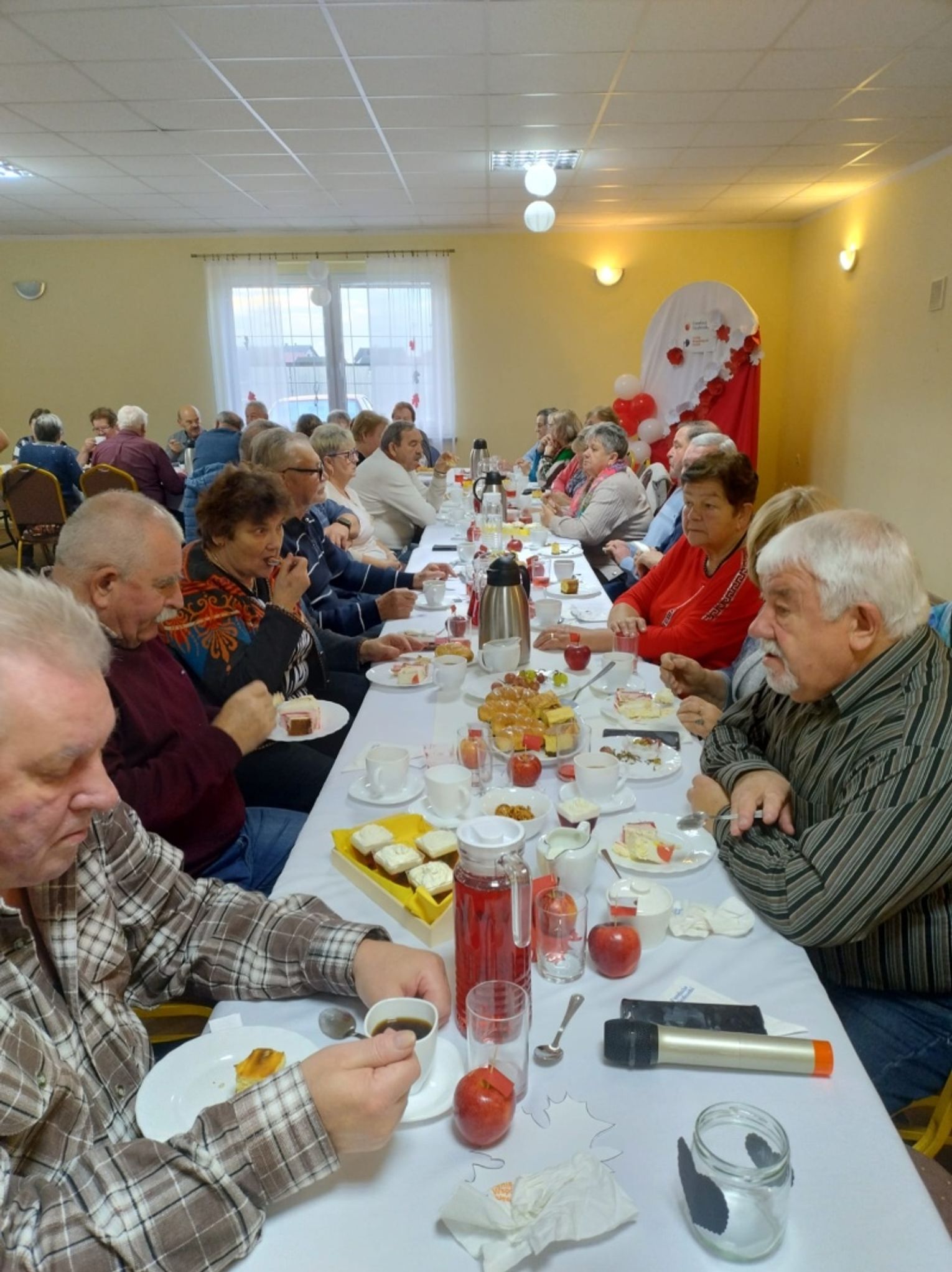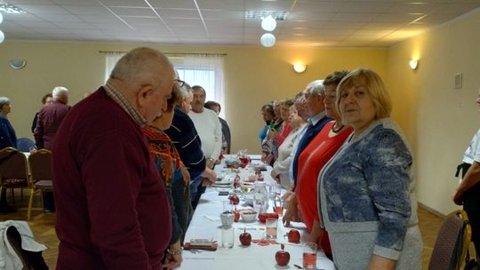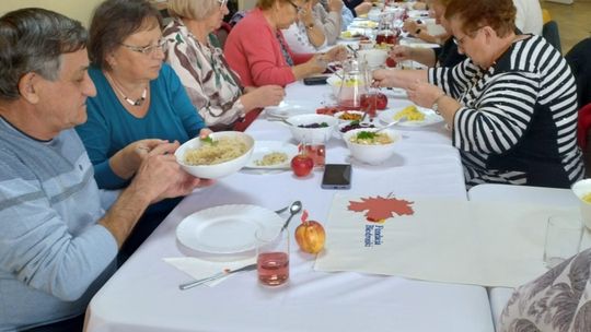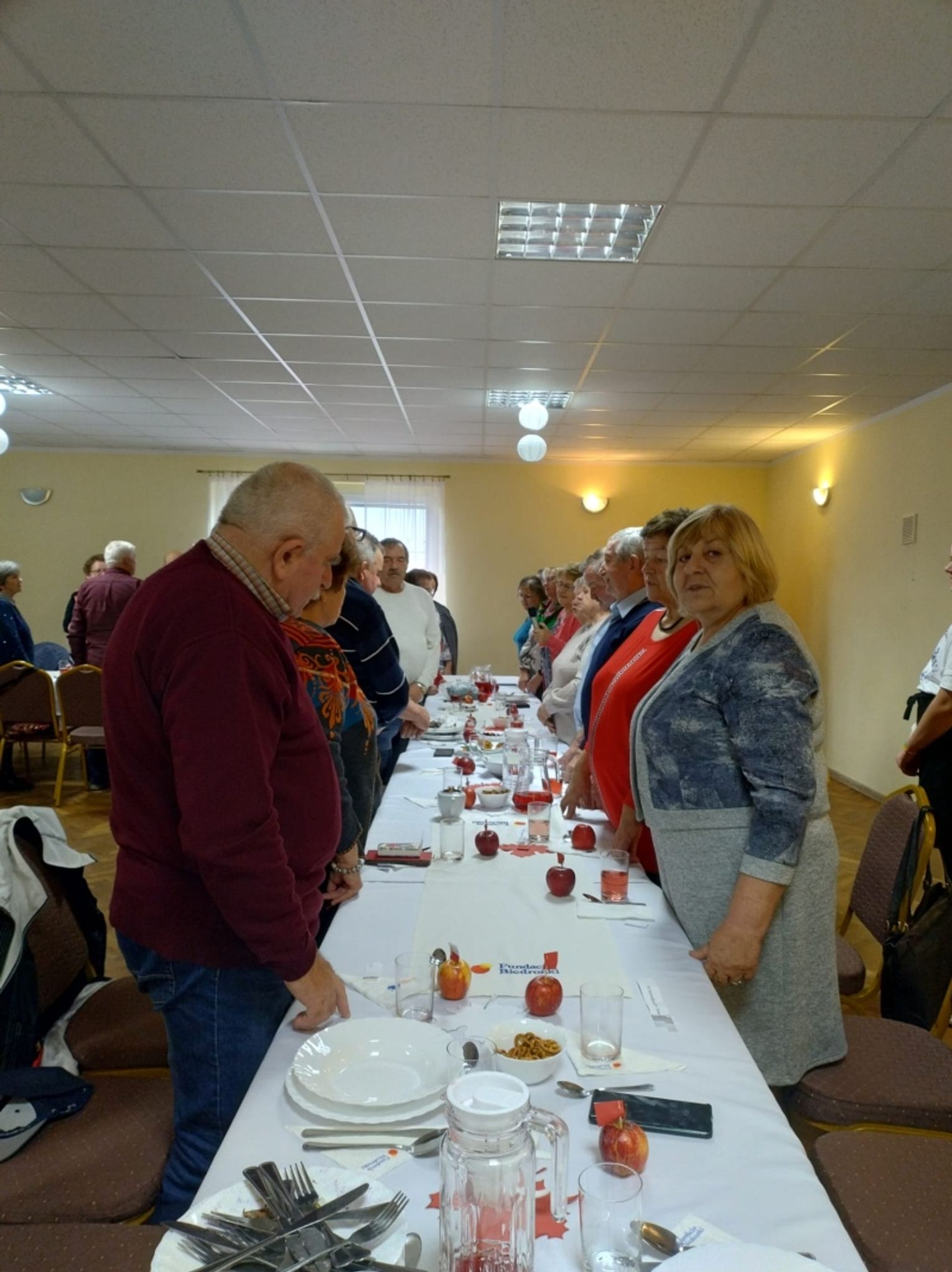 Na stołach pojawiły się klasyczne dania: rosół z domowym makaronem, przygotowanym przez panie ze świetlicy, pieczona kaczka, roladki drobiowe oraz schab zapiekany z wędzoną śliwką. Całość uzupełniały ziemniaki, sos żurawinowy i zestaw trzech surówek. Do napojów podano słodki poczęstunek: tort z okazji jubileuszowego spotkania, sernik, rogaliki oraz owoce w galaretce z bitą śmietaną - wszystko utrzymane w narodowej kolorystyce.