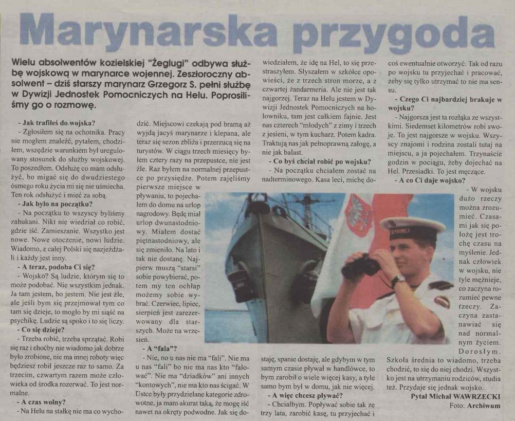 - Nie, no u nas nie ma “fali”. Nie ma u nas “fali” bo nie ma nas kto “falować”. Nie ma “dziadków” ani innych “kontowych”, nie ma kto nas ścigać. W Ustce były przydzielane kategorie zdrowotne, ja mam akurat taką, że mogę iść nawet na okręty podwodne. Jak się dowiedziałem, że idę na Hel, to się przestraszyłem. Słyszałem w szkółce opowieści, że z trzech stron morze, a z czwartej żandarmeria. Ale nie jest tak najgorzej. Teraz na Helu jestem w Dywizji Jednostek Pomocniczych na holowniku, tam jest całkiem fajnie. Jest nas czterech “młodych” z zimy i trzech z jesieni, w tym kucharz. Potem kadra. Traktują nas jak pełnoprawną załogę, a nie jak balast.