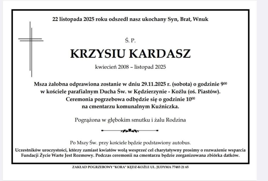 O godzinie 9:00 w kościele parafialnym Ducha Świętego w Kędzierzynie-Koźlu (os. Piastów) odbędzie się msza żałobna. Ceremonia pogrzebowa zaplanowana jest na godzinę 10:00 na cmentarzu komunalnym Kuźniczka.