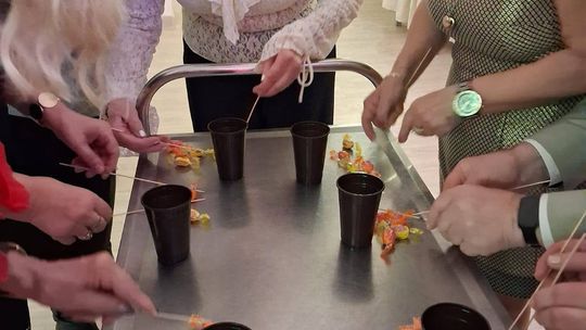 Nie zabrakło też dwóch konkursów. Jeden z nich polegał na rzucaniu małych plastikowych bombek choinkowych, którymi trzeba było trafić do ponumerowanych kubeczków. Ten z uczestników zabawy, który zdobył najwięcej punktów, mógł liczyć na słodkie nagrody w postaci czekolady i ciastek. Podobnie zresztą jak w drugim z konkursów, który polegał na chwytaniu cukierków pałeczkami i przenoszeniu ich ze stolików do wspomnianych wcześniej kubeczków.