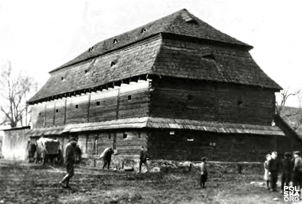 Spichlerz dworski jeszcze na pierwotnej lokalizacji w Sławięcicach. Fot. Max Glauer, reprod. "Oberschlesische Landbaukunst in Oberschlesien” w 1937 r.