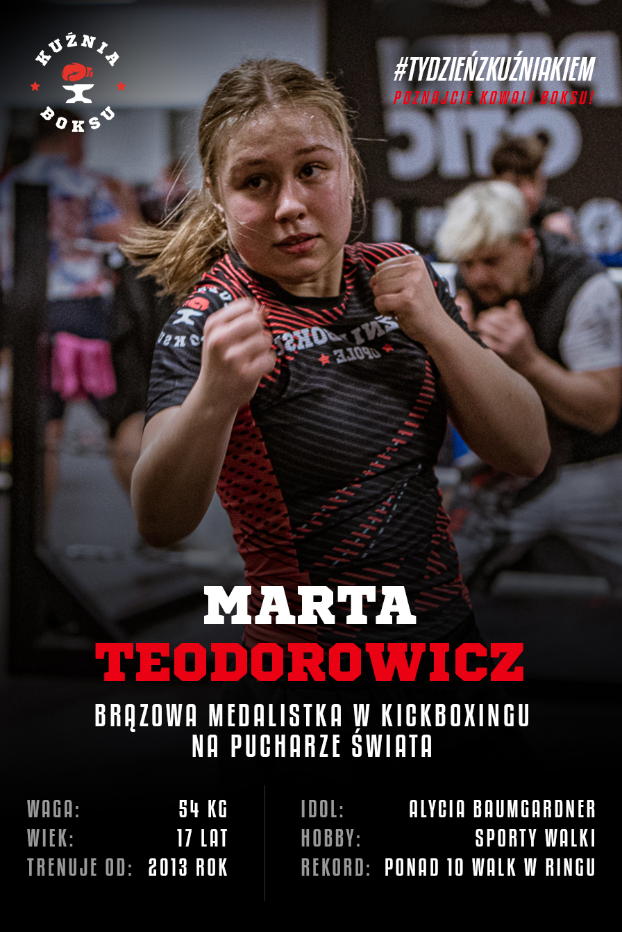 „Marta Teodorowicz to bardzo miła i zawsze uśmiechnięta zawodniczka, nawet gdy jest naprawdę ciężko. Jest zdolna do wielu wyrzeczeń i poświęceń dla sportu. Do naszego klubu dołączyła za namową Bartka Słodkowskiego, który prowadzi ją w kopanych sportach walki. Pod szyldem Kuźni Boksu stoczyła już trzy walki na imprezach centralnych, a to dopiero początek. Marta jest bardzo ambitna i energiczna. Uśmiechnięta, ale potrafi pokazać pazur. Na treningach sumiennie realizuje każde zadanie. Pokładam w niej duże nadzieje, bo wiem, że nie pokazała jeszcze wszystkiego, na co ją stać. W nadchodzącym roku celujemy w medal na Mistrzostwach Polski juniorek” – kończy trener Dawid Dużyński.