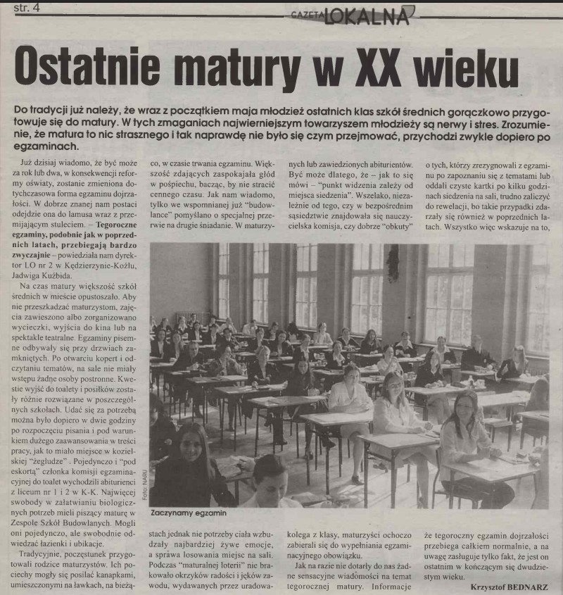 Na czas matury większość szkół średnich w mieście opustoszało. Aby nie przeszkadzać maturzystom, zajęcia zawieszono albo zorganizowano wycieczki, wyjścia do kina lub na spektakle teatralne. Egzaminy pisemne odbywały się przy drzwiach zamkniętych. Po otwarciu kopert i odczytaniu tematów, na sale nie miały wstępu żadne osoby postronne. Kwestie wyjść do toalety i posiłków zostały różnie rozwiązane w poszczególnych szkołach. Udać się za potrzebą można było dopiero w dwie godziny po rozpoczęciu pisania i pod warunkiem dużego zaawansowania w treści pracy, jak to miało miejsce w kozielskiej “żegludze” . Pojedynczo i “pod eskortą” członka komisji egzaminacyjnej do toalet wychodzili abiturienci z liceum nr 1 i 2 w K-K. Najwięcej swobody w załatwianiu biologicznych potrzeb mieli piszący maturę w Zespole Szkół Budowlanych. Mogli oni pojedynczo, ale swobodnie odwiedzać łazienki i ubikacje. Tradycyjnie, poczęstunek przygotowali rodzice maturzystów. Ich pociechy mogły się posilać kanapkami, umieszczonymi na ławkach, na bieżą co, w czasie trwania egzaminu. Większość zdających zaspokajała głód w pośpiechu, bacząc, by nie stracić cennego czasu. Jak nam wiadomo, tylko we wspomnianej już “budowlance” pomyślano o specjalnej przerwie na drugie śniadanie. W maturzystach jednak nie potrzeby ciała wzbudzały najbardziej żywe emocje, a sprawa losowania miejsc na sali. Podczas “maturalnej loterii” nie brakowało okrzyków radości i jęków zawodu, wydawanych przez uradowanych lub zawiedzionych abiturientów. Być może dlatego, że - jak to się mówi - “punkt widzenia zależy od miejsca siedzenia”. Wszelako, niezależnie od tego, czy w bezpośrednim sąsiedztwie znajdowała się nauczycielska komisja, czy dobrze “obkuty” kolega z klasy, maturzyści ochoczo zabierali się do wypełniania egzaminacyjnego obowiązku. Jak na razie nie dotarły do nas żadne sensacyjne wiadomości na temat tegorocznej matury. Informacje o tych, którzy zrezygnowali z egzaminu po zapoznaniu się z tematami lub oddali czyste kartki po kilku godzinach siedzenia na sali, trudno zaliczyć do rewelacji, bo takie przypadki zdarzały się również w poprzednich latach. Wszystko więc wskazuje na to, że tegoroczny egzamin dojrzałości przebiega całkiem normalnie, a na uwagę zasługuje tylko fakt, że jest on ostatnim w kończącym się dwudziestym wieku.