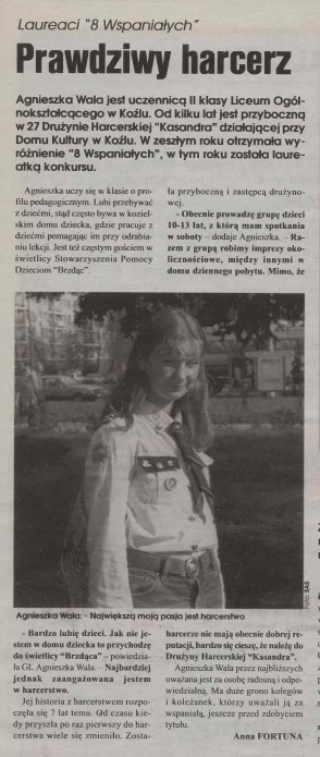 - Obecnie prowadzę grupę dzieci 10-13 lat, z którą mam spotkania w soboty - dodaje Agnieszka. Razem z grupą robimy imprezy okolicznościowe, między innymi w domu dziennego pobytu. Mimo, że harcerze nie mają obecnie dobrej reputacji, bardzo się cieszę, że należę do Drużyny Harcerskiej “Kasandra”. Agnieszka Wala przez najbliższych uważana jest za osobę radosną i odpowiedzialną. Ma duże grono kolegów i koleżanek, którzy uważali ją za wspaniałą, jeszcze przed zdobyciem tytułu.