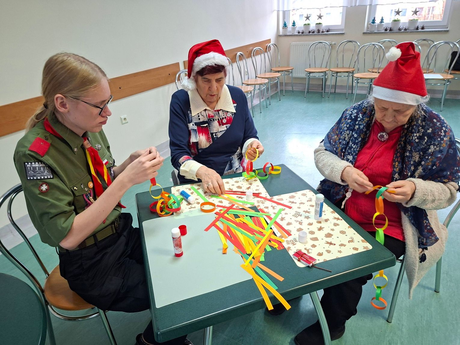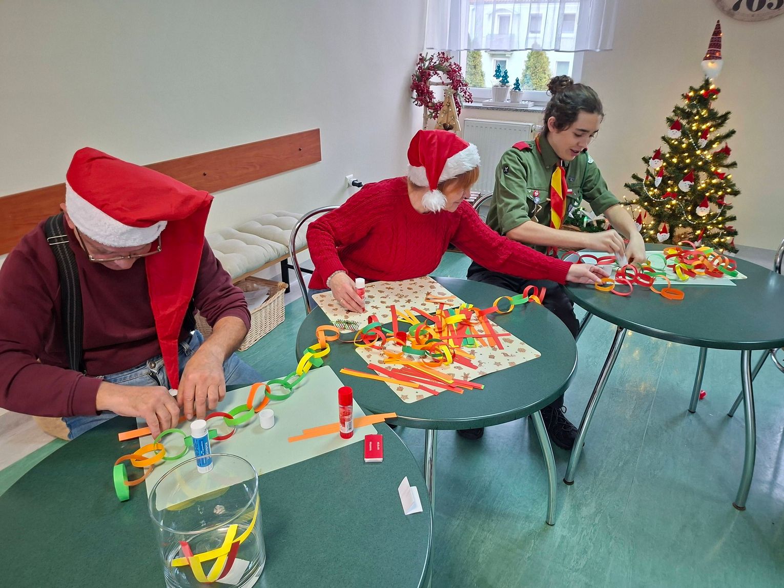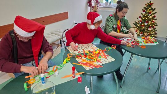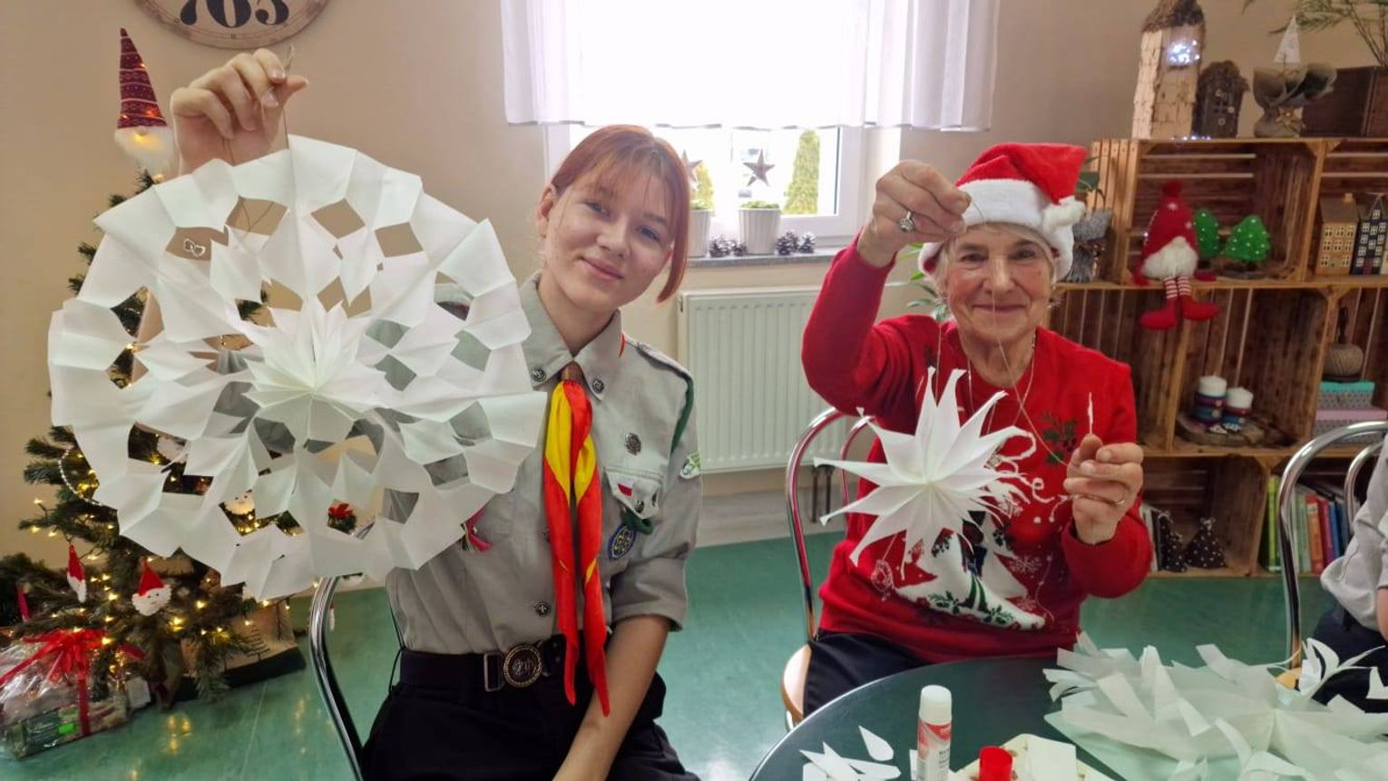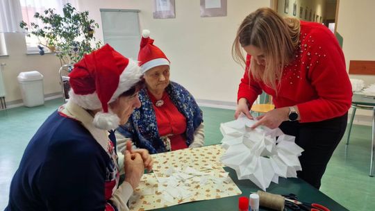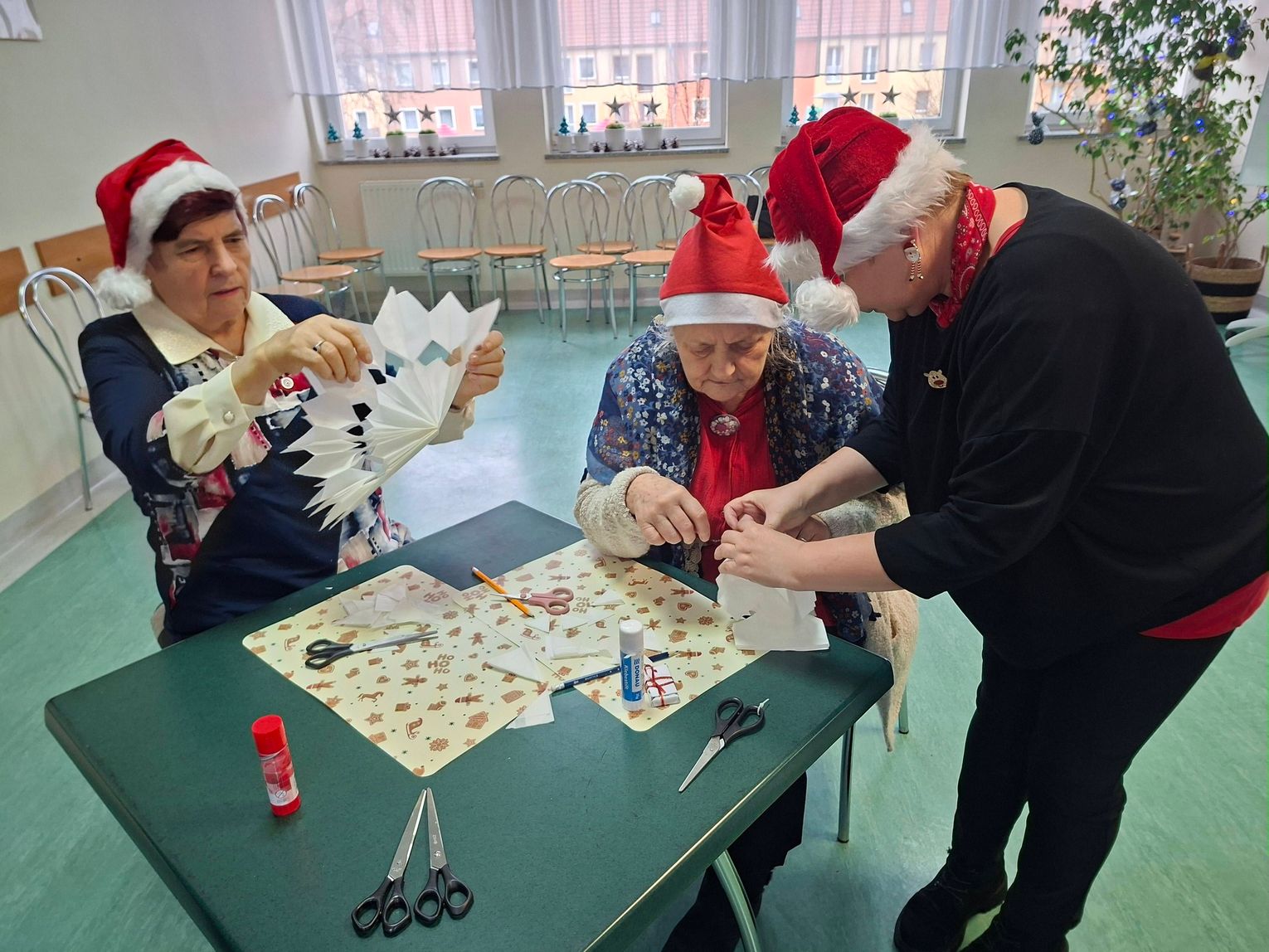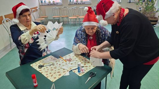 Seniorzy z „Naszego Domu” wspólnie z młodzieżą stworzyli piękne papierowe śnieżynki, a także kolorowy łańcuch na choinkę.