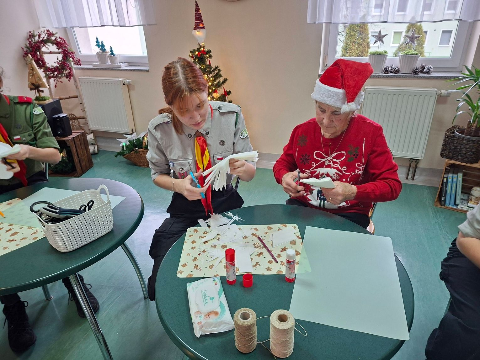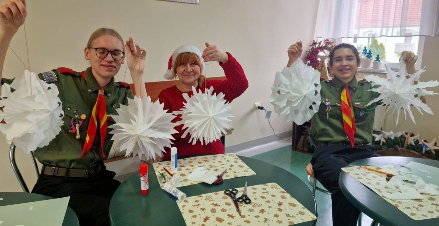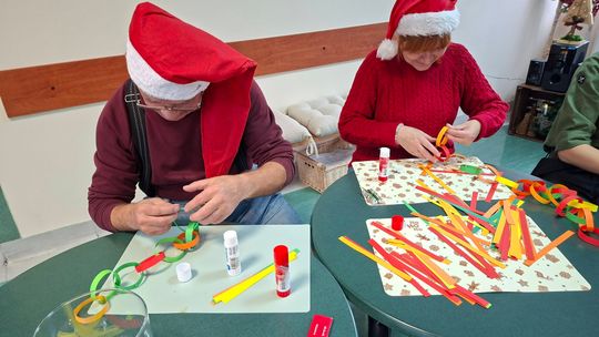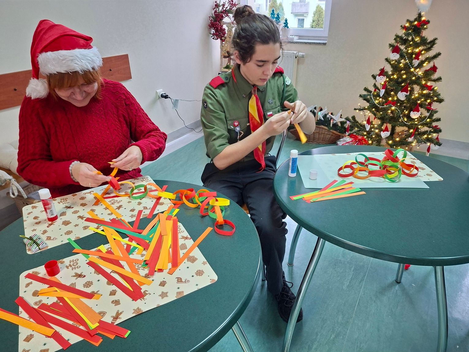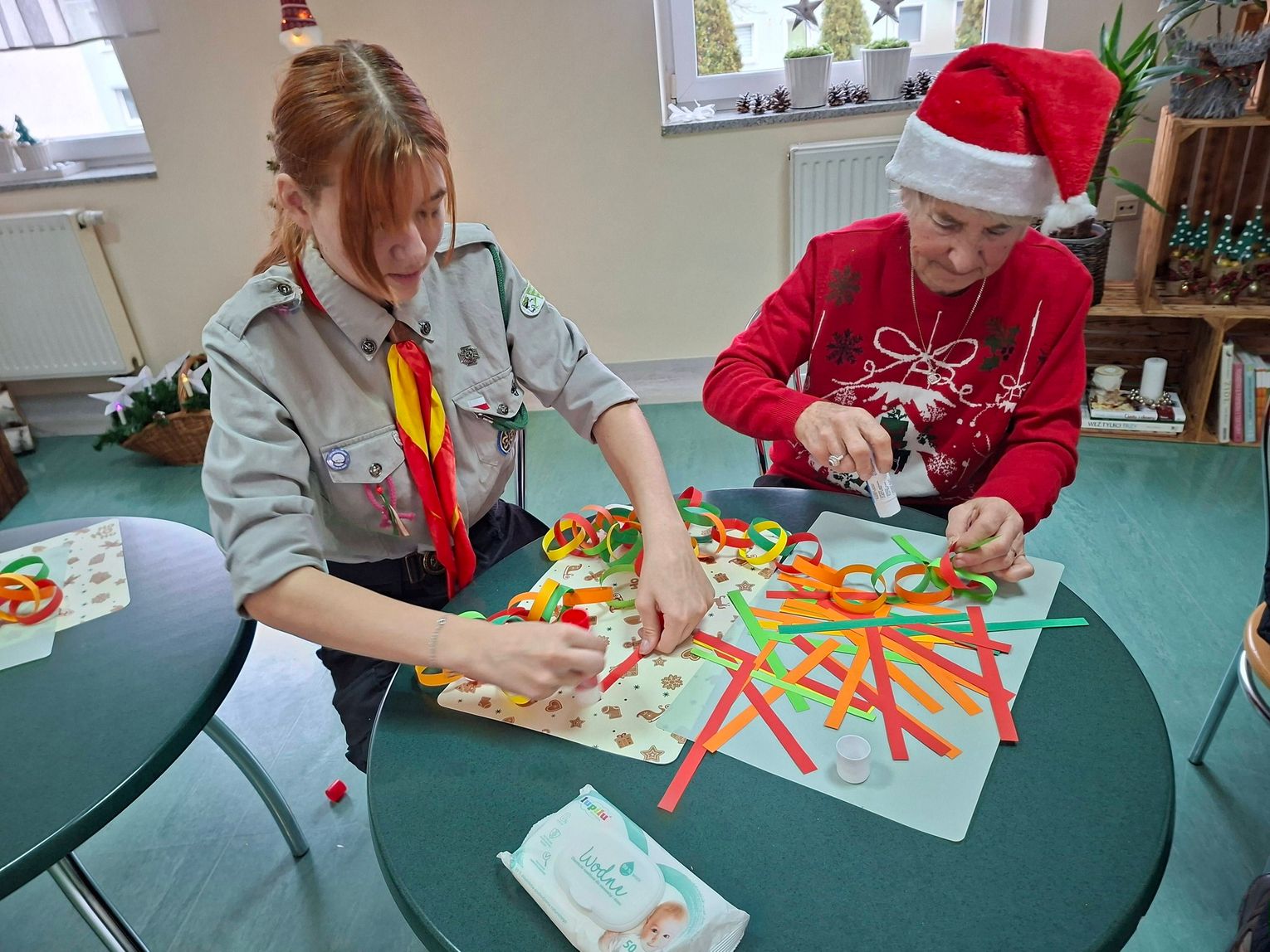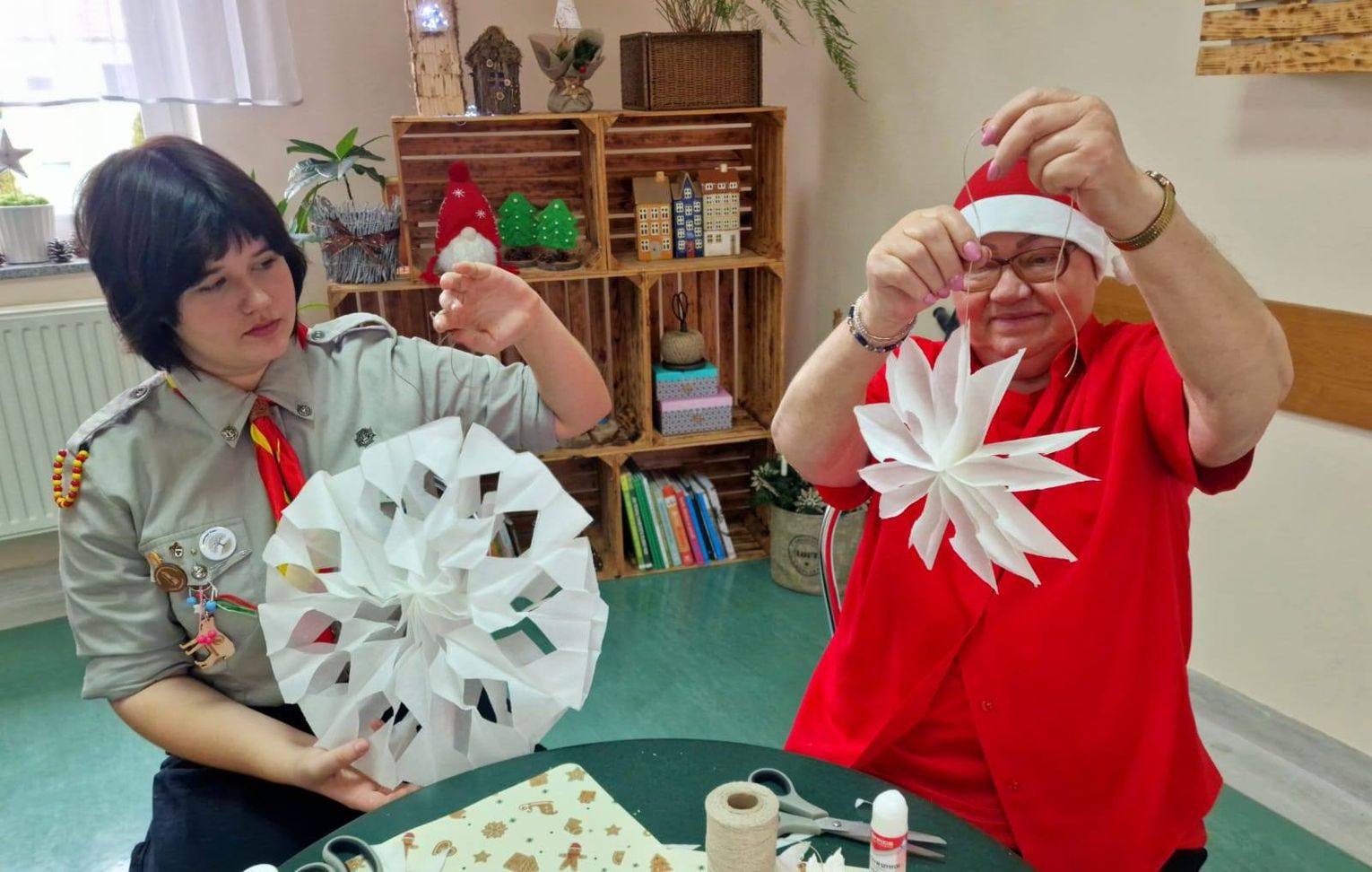 Seniorzy z „Naszego Domu” wspólnie z młodzieżą stworzyli piękne papierowe śnieżynki, a także kolorowy łańcuch na choinkę.