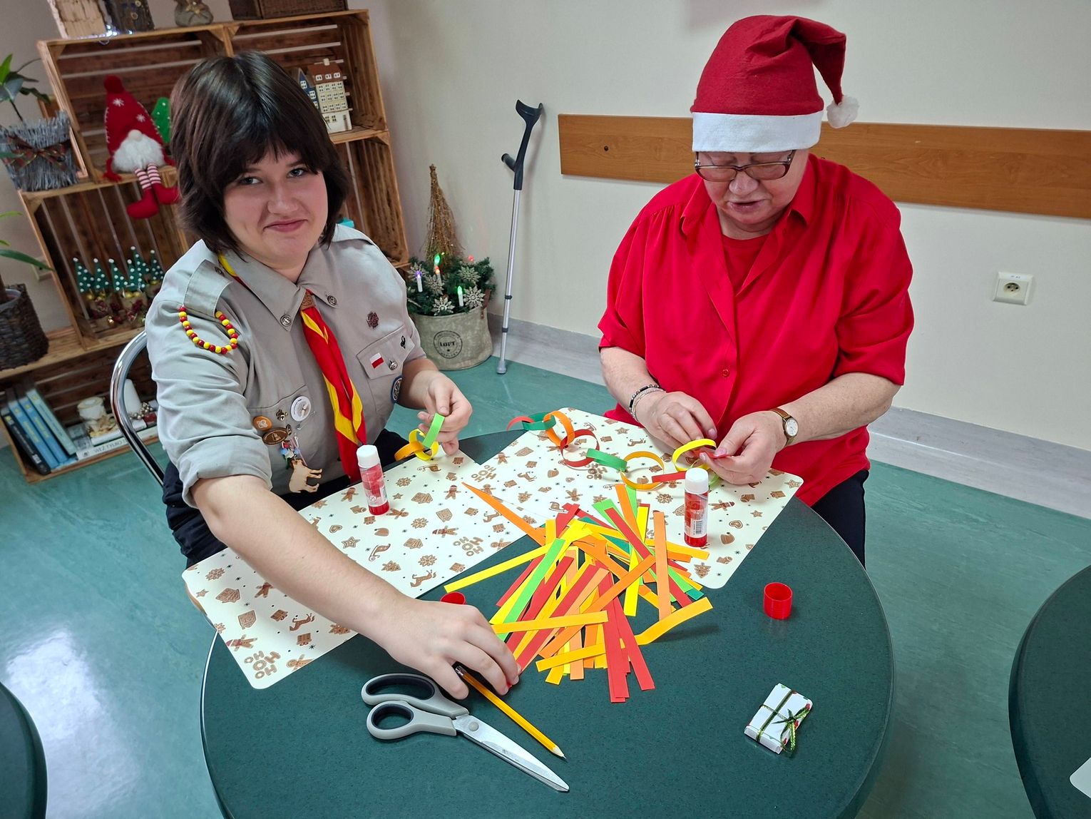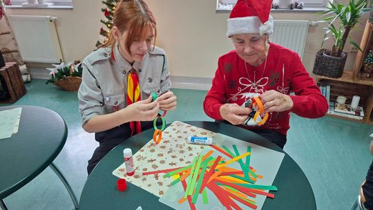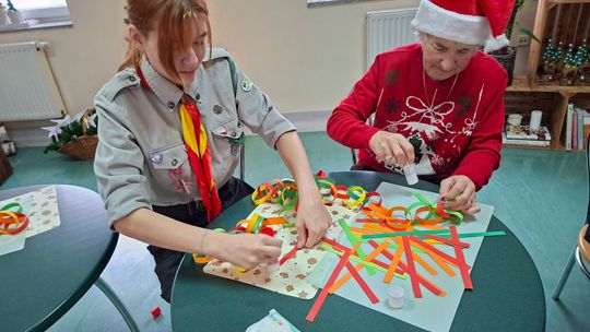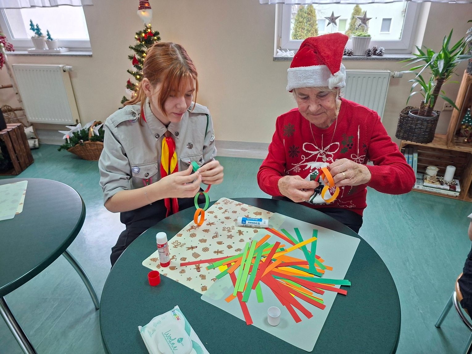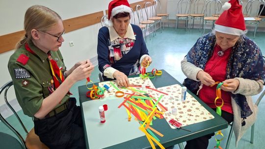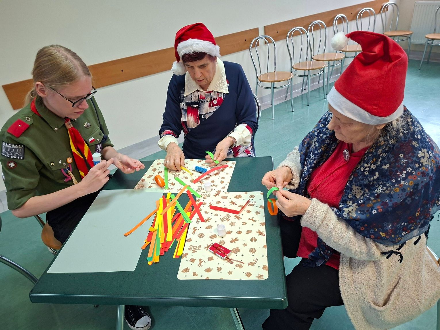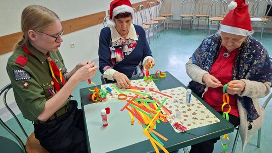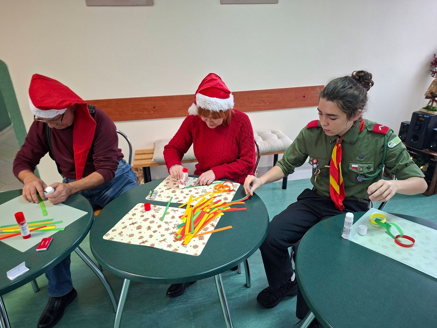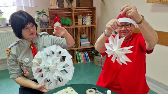 Seniorzy z „Naszego Domu” wspólnie z młodzieżą stworzyli piękne papierowe śnieżynki, a także kolorowy łańcuch na choinkę.