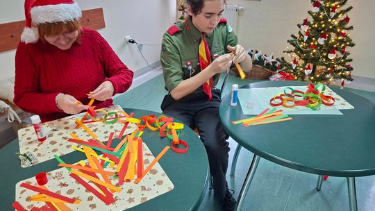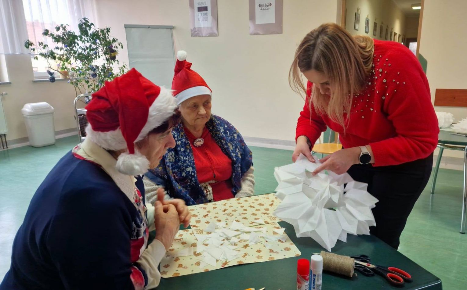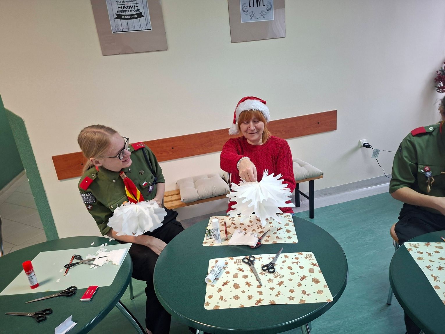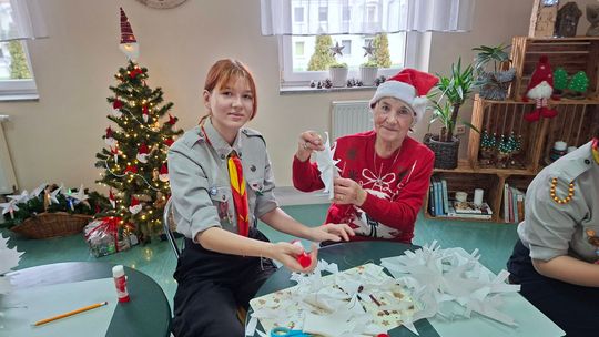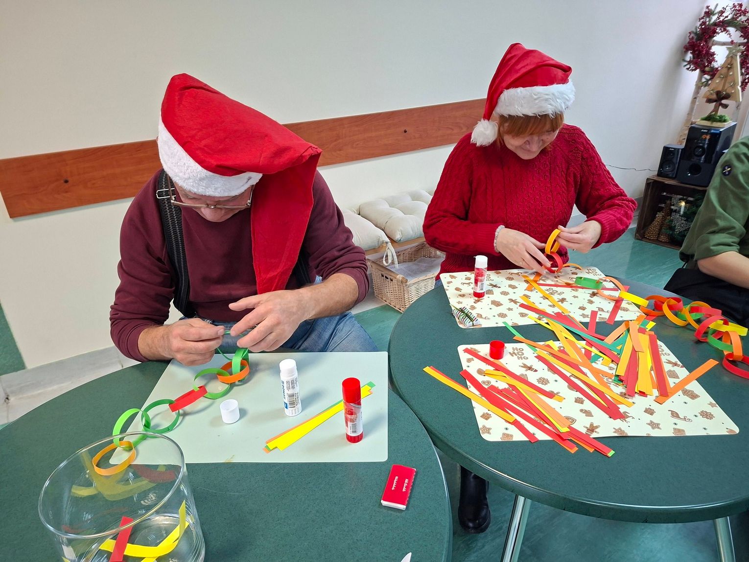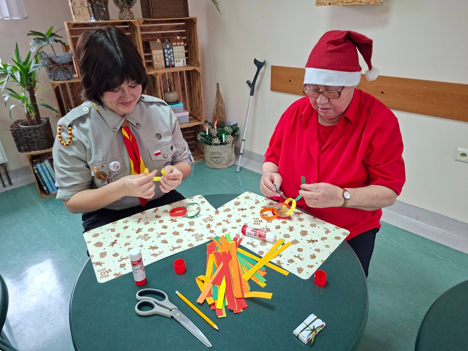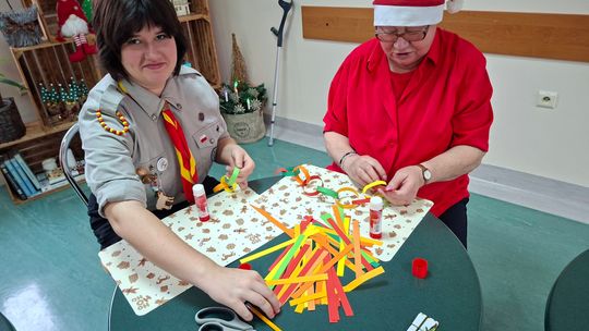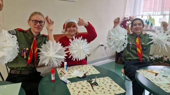 Seniorzy z „Naszego Domu” wspólnie z młodzieżą stworzyli piękne papierowe śnieżynki, a także kolorowy łańcuch na choinkę.