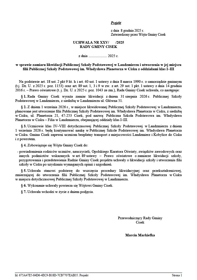 Pierwszy projekt przewiduje likwidację Publicznej Szkoły Podstawowej w Landzmierzu z dniem 31 sierpnia 2026 roku. Od 1 września 2026 roku w jej miejscu miałaby funkcjonować filia PSP w Cisku, obejmująca klasy I-III. Uczniowie starszych roczników mieliby kontynuować naukę w Cisku, a gmina zapewniłaby im bezpłatny transport z Landzmierza i Kobylic.