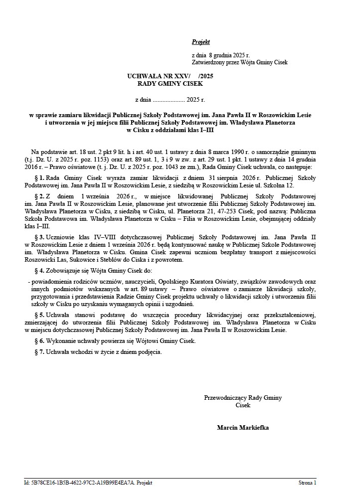 Drugi projekt dotyczy Publicznej Szkoły Podstawowej im. Jana Pawła II w Roszowickim Lesie. Likwidacja tej placówki również została zaplanowana na 31 sierpnia 2026 roku, a od 1 września 2026 roku w jej miejscu miałaby działać filia PSP w Cisku z oddziałami klas I–III. Starsi uczniowie mieliby być dowożeni do Ciska z Roszowickiego Lasu, Sukowic i Steblowa.