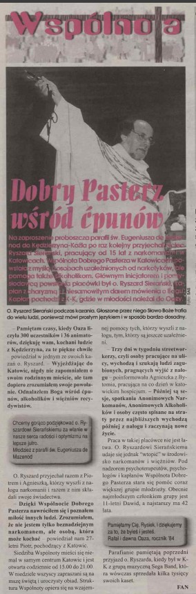 O. Ryszard przyjechał razem z Piotrem i Agnieszką, którzy wyszli z nałogu narkomanii i razem z nim składali swoje świadectwa. - Dzięki Wspólnocie Dobrego Pasterza nawróciłem się i poznałem miłość innych ludzi. Zrozumiałem, że nie jestem tylko beznadziejnym narkomanem, ale osobą, która może kochać - powiedział nam 27- letni Piotr, pochodzący z Katowic. Siedziba Wspólnoty mieści się niemal w samym centrum Katowic i jest otwarta codziennie od 15.00 do 21.00. W niedziele wszyscy zapraszani są na mszę świętą i uroczysty obiad. Struktura Wspólnoty opiera się na wzajemnej pomocy tych, którzy wyszli z nałogu, tym, którzy są jeszcze uzależnieni. - Trzy dni w tygodniu streetworkerzy, czyli osoby pracujące na ulicy, wychodzą i szukają ludzi zagubionych, pragnących wyjść z nałogu - poinformowała Agnieszka z Bytomia, pracująca na co dzień w katowickim hospicjum. - Później są sesje, spotkania Anonimowych Narkomanów, Anonimowych Alkoholików i osoby często spisane na straty przez najbliższych wychodzą później z nałogu i zaczynają nowe życie. Praca w takiej placówce nie jest łatwa. O. Ryszardowi Sierańskiemu udaje się jednak “wtopić” w środowisko narkomanów i więźniów. Pod nadzorem psychoterapeutów, psychologów i kapłanów Wspólnota Dobrego Pasterza stara się pomóc coraz większej grupie młodzieży. Obecnie najmłodszym członkiem grupy jest 11-letni Dawid, a najstarszy ma 42 lata.