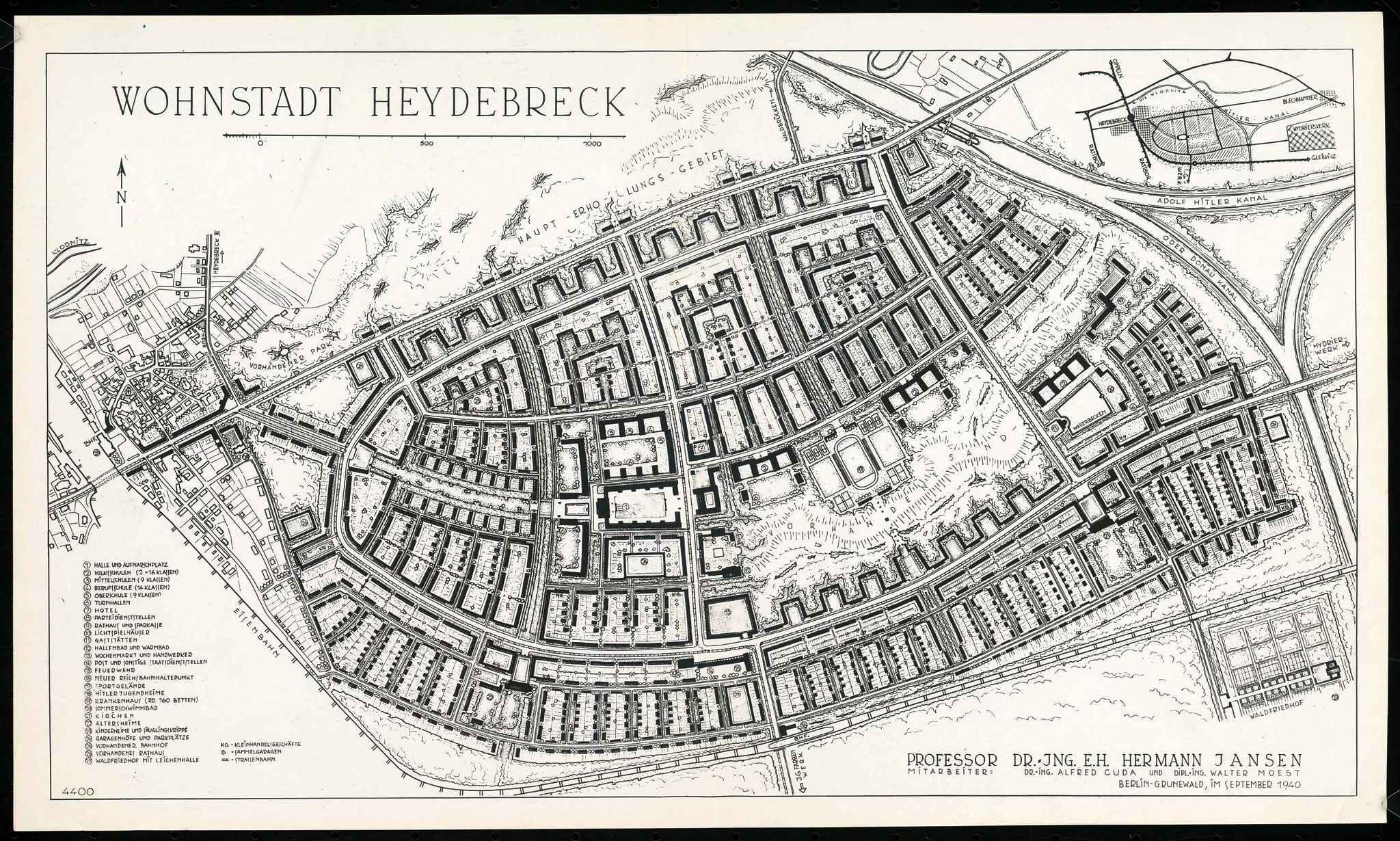 Plan prof. Hermanna Jansena z 1940 roku uwzględnia takie obiekty, jak: 1. Hala i plac apelowy; 2. Szkoły powszechne (2 × 16 klas); 3. Szkoły średnie (9 klas); 4. Szkoła zawodowa (14 klas); 5. Szkoła wyższa / liceum (9 klas); 6. Hale gimnastyczne; 7. Hotel; 8. Siedziby partii; 9. Ratusz i kasa oszczędnościowa; 10. Kino (Lichtspielhaus); 11. Gospody / zajazdy; 12. Basen kryty i łaźnia; 13. Targ tygodniowy i rzemieślnicy; 14. Poczta i inne urzędy państwowe; 15. Straż pożarna; 16. Nowy przystanek kolejowy; 17. Tereny sportowe; 18. Domy Hitlerjugend; 19. Szpital (ok. 160 łóżek); 20. Basen letni; 21. Kościoły; 22. Domy starców; 23. Domy dziecka i żłobek; 24. Garaże i parkingi; 25. Istniejący dworzec kolejowy; 26. Istniejący ratusz; 27. Cmentarz leśny z kaplicą pogrzebową