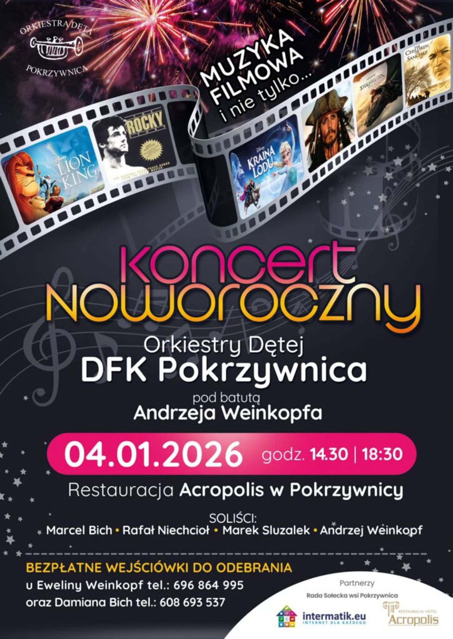 Zaledwie tydzień później, 4 stycznia, Pokrzywnica zaprosi mieszkańców na dwie odsłony Koncertu Noworocznego pod hasłem "Muzyka filmowa i nie tylko…". Orkiestra Dęta DFK Pokrzywnica, prowadzona przez Andrzeja Weinkopfa, wystąpi w Restauracji Acropolis o godzinie 14:30 i 18:30. W programie znajdą się motywy z takich filmów jak "Król Lew", "Rocky", "Piraci z Karaibów" czy "Opowieści z Narnii". Na scenie pojawią się soliści: Marcel Bich, Rafał Niechcioł, Marek Sluzalek i sam dyrygent. Wstęp jest bezpłatny, a wejściówki można odebrać u organizatorów.