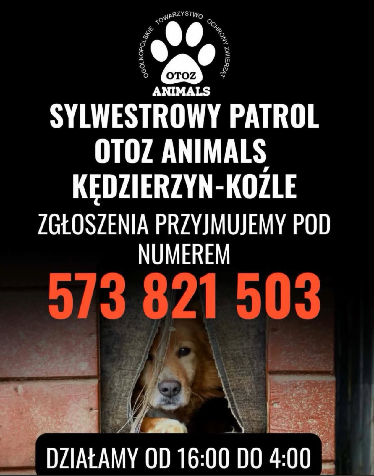 Ogólnopolskie Towarzystwo Ochrony Zwierząt Animals w Kędzierzynie-Koźlu uruchamia w noc sylwestrową specjalny, mobilny patrol. Organizacja przyjmuje zgłoszenia dotyczące przestraszonych i zagubionych zwierząt pod numerem telefonu 573 821 503. Interwencje w terenie będą prowadzone w środę 31 grudnia od godz. 16.00 do czwartku 1 stycznia do godz. 4.00. Inspektorzy OTOZ Animals wraz z wolontariuszami mają reagować na wezwania i pomagać w bezpiecznym odławianiu zwierząt, które uciekły w panice po wybuchach fajerwerków.