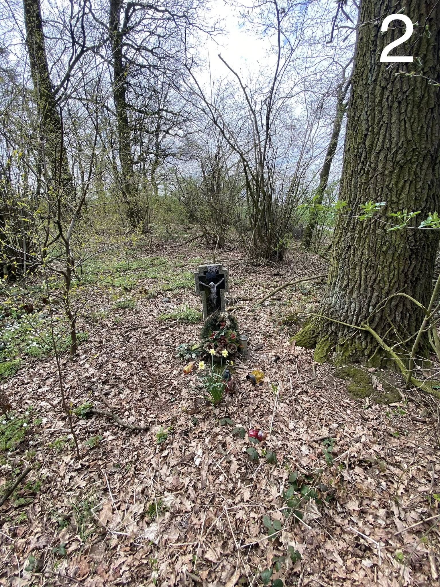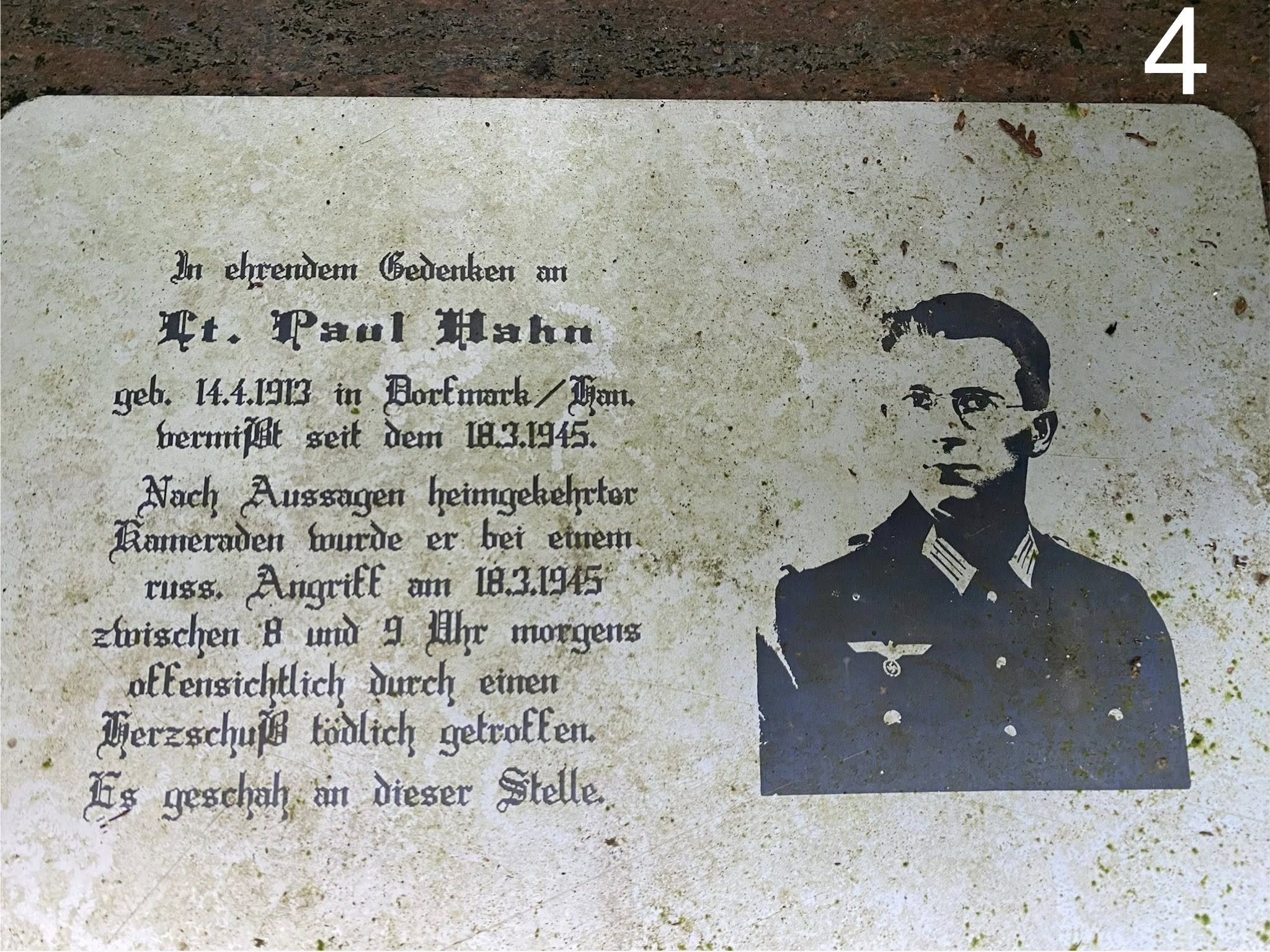 Druga mogiła żołnierska (zdjęcia nr 3, 4, 5) posiada tabliczkę wraz z opisem z którego wynika, że w tym miejscu 18.03.1945 roku, między godziną 8 a 9 rano, zginął porucznik Paul Hahn, zastrzelony przez radzieckich żołnierzy.