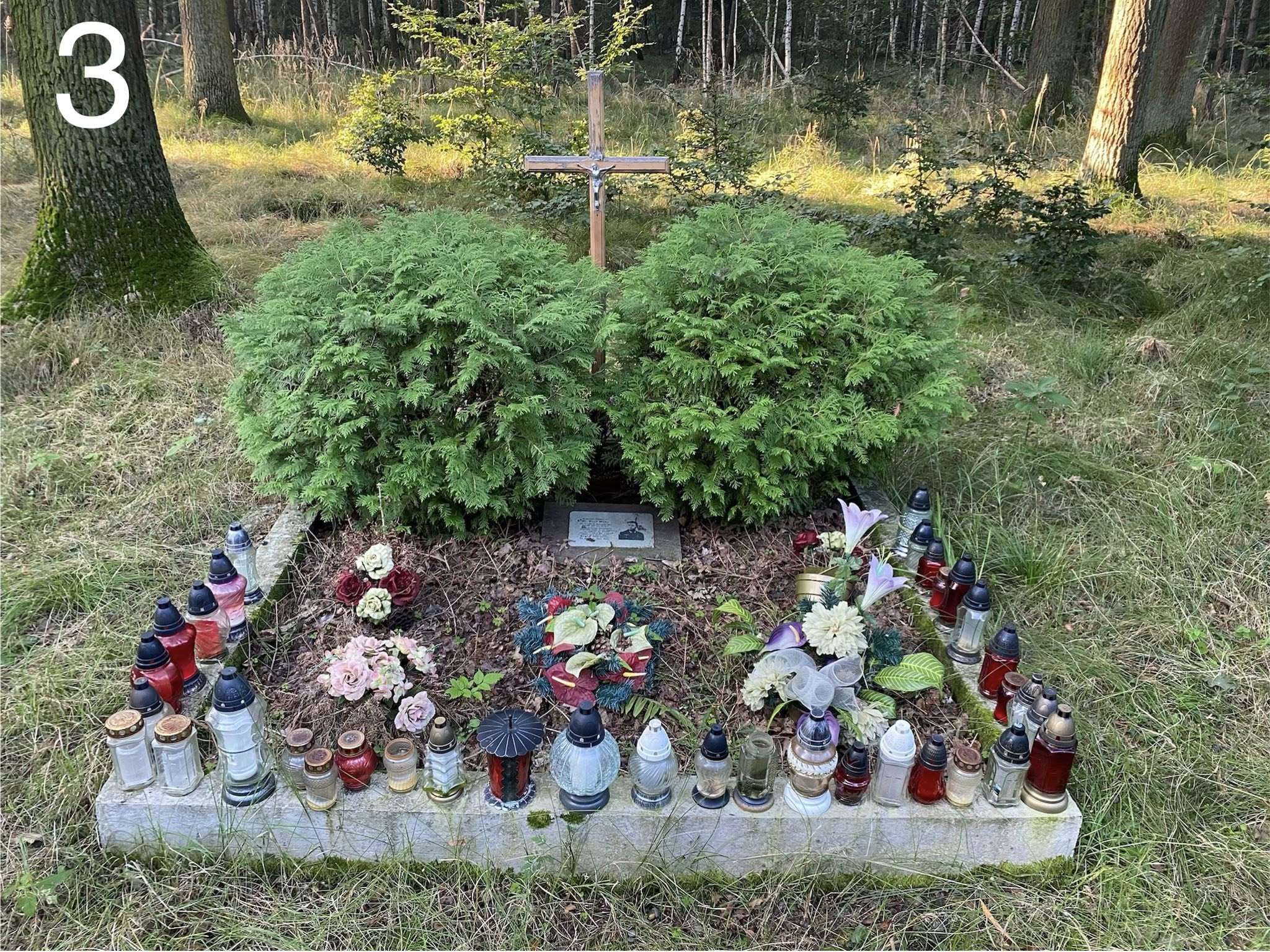 Udało mu się poznać dwie lokalizacje, obie położone dość blisko boiska sportowego. Jedna informacja o mogile pochodzi od pracownika leśnego, który uzyskał ją od swojego przodka, również pracującego po wojnie w lesie. W tamtym czasie, czyli zaraz po zakończeniu wojny wszystkie mogiły były oznaczone, a ich lokalizacje przeniesione na mapy. Ile ich mogło być?