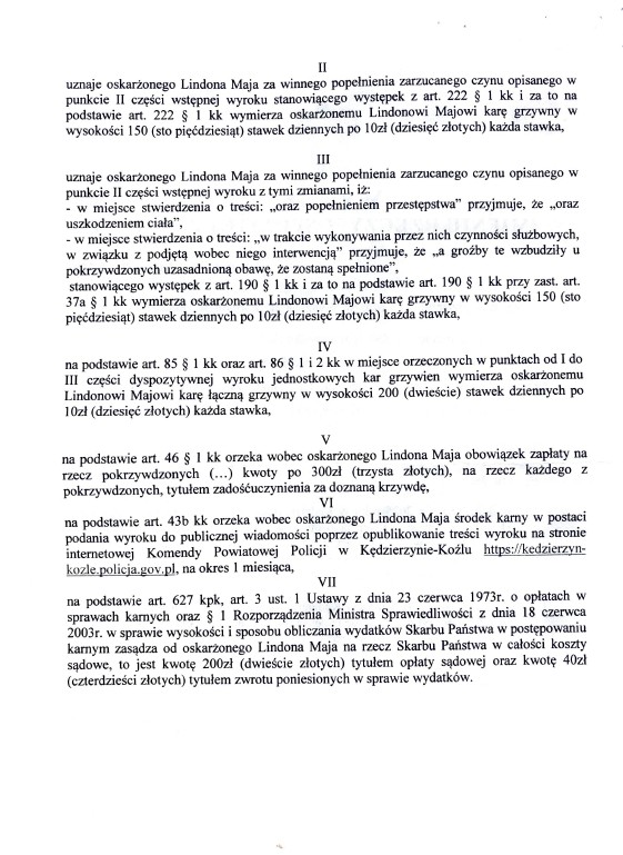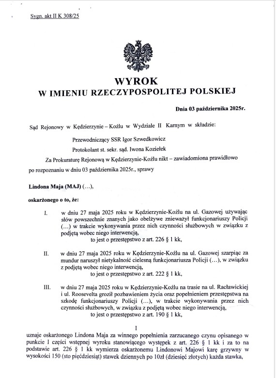 Interwencji funkcjonariuszy miała miejsce pod koniec maja 2025 roku na terenie Kędzierzyna-Koźla. Policjanci najpierw zostali znieważeni słownie, a następnie mężczyzna zaczął szarpać ich za mundury i groził im pozbawieniem życia. Sąd, analizując zgromadzony w sprawie materiał dowodowy, zasądził od pozwanego zadośćuczynienie na rzecz funkcjonariuszy w kwocie 300 złotych, grzywnę w łącznej kwocie 6500 złotych oraz zwrócenia kosztów procesu. Treść wyroku do publicznej wiadomości podała Komenda Powiatowa Policji w Kędzierzynie-Koźlu. Jego treść poniżej.
