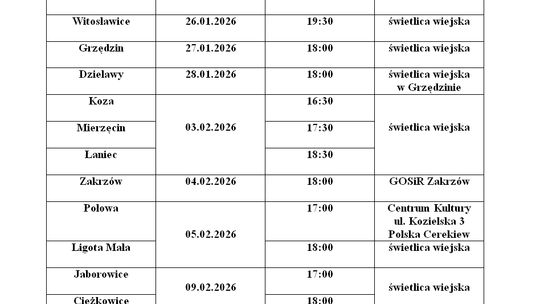 W kolejnych dniach cykl przeniesie się do pozostałych sołectw. W Kozie zebranie zaplanowano 3 lutego na godz. 16:30 w świetlicy wiejskiej, tego samego dnia w Mierzęcinie mieszkańcy spotkają się o godz. 17:30, również w świetlicy, a Łaniec zaprasza na zebranie o godz. 18:30. Zakrzów na swoje zebranie zaprasza 4 lutego o godz. 18:00 do GOSiR. W Połowie spotkanie odbędzie się 5 lutego o godz. 17:00 w Centrum Kultury w Polskiej Cerekwi; w Ligocie Małej zabranie zaplanowano tego samego dnia o godz. 18:00 w świetlicy wiejskiej.