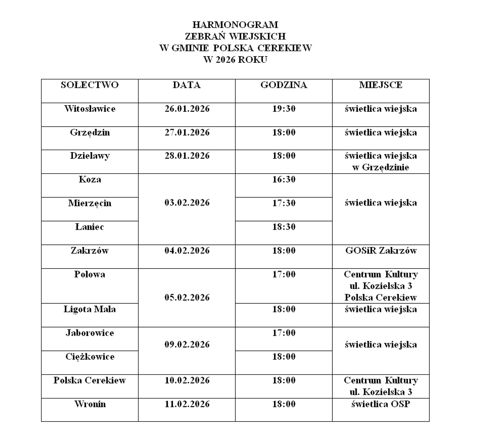 W gminie Polska Cerekiew zebrania wiejskie rozpoczną się pod koniec stycznia i potrwają do połowy lutego. Spotkania odbędą się w świetlicach wiejskich, lokalnych ośrodkach kultury oraz w siedzibach OSP.