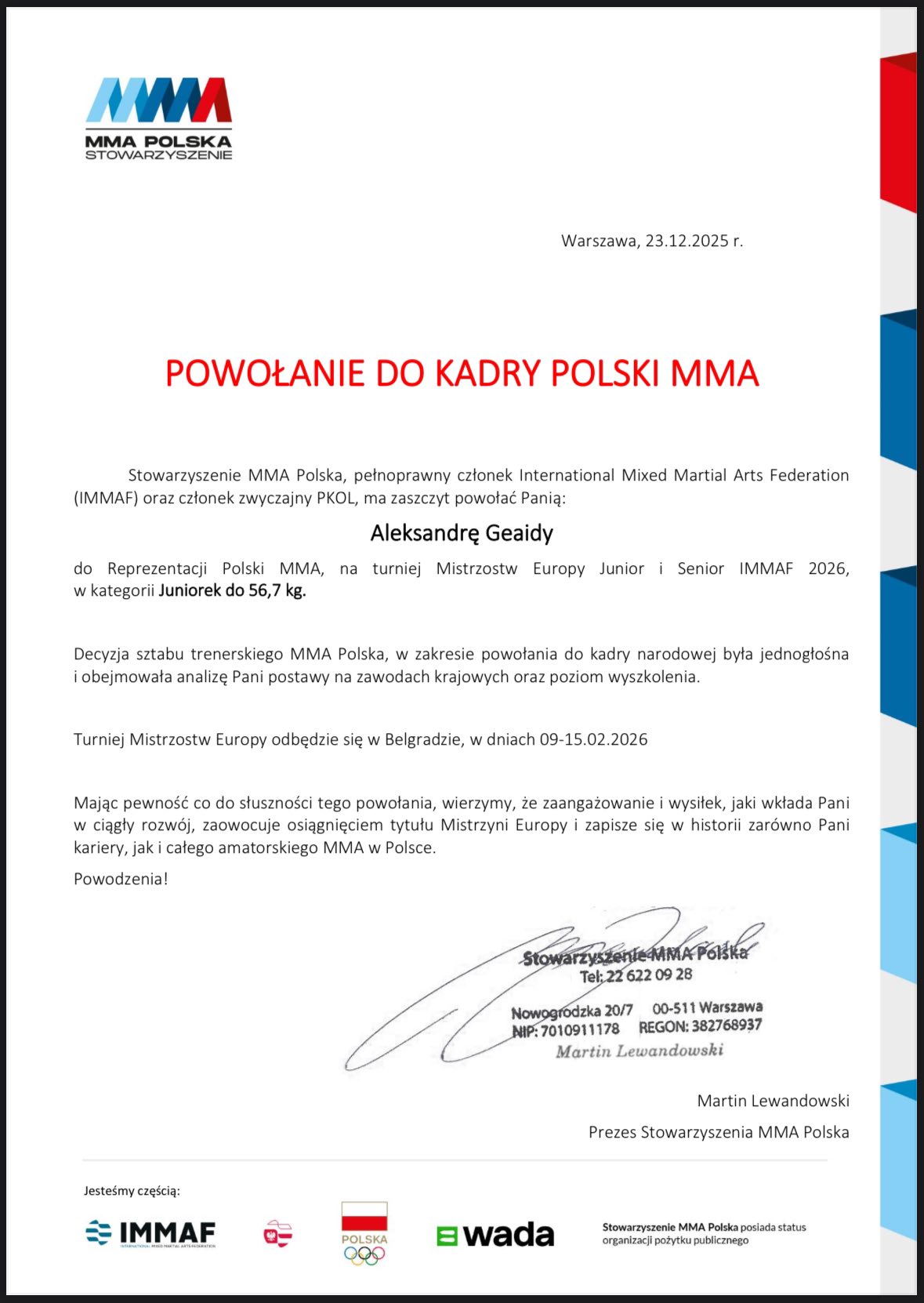 Potwierdzeniem jej ciężkiej pracy jest oficjalne powołanie do Reprezentacji Polski MMA, wystawione przez Stowarzyszenie MMA Polska. Zawodniczka będzie reprezentować kraj podczas Mistrzostw Europy IMMAF Junior i Senior, które odbędą się 10–15 lutego 2026 roku w Belgradzie (Serbia), w kategorii juniorek do 56,7 kg. Decyzja sztabu szkoleniowego była jednogłośna i oparta na analizie jej postawy sportowej oraz poziomu wyszkolenia.