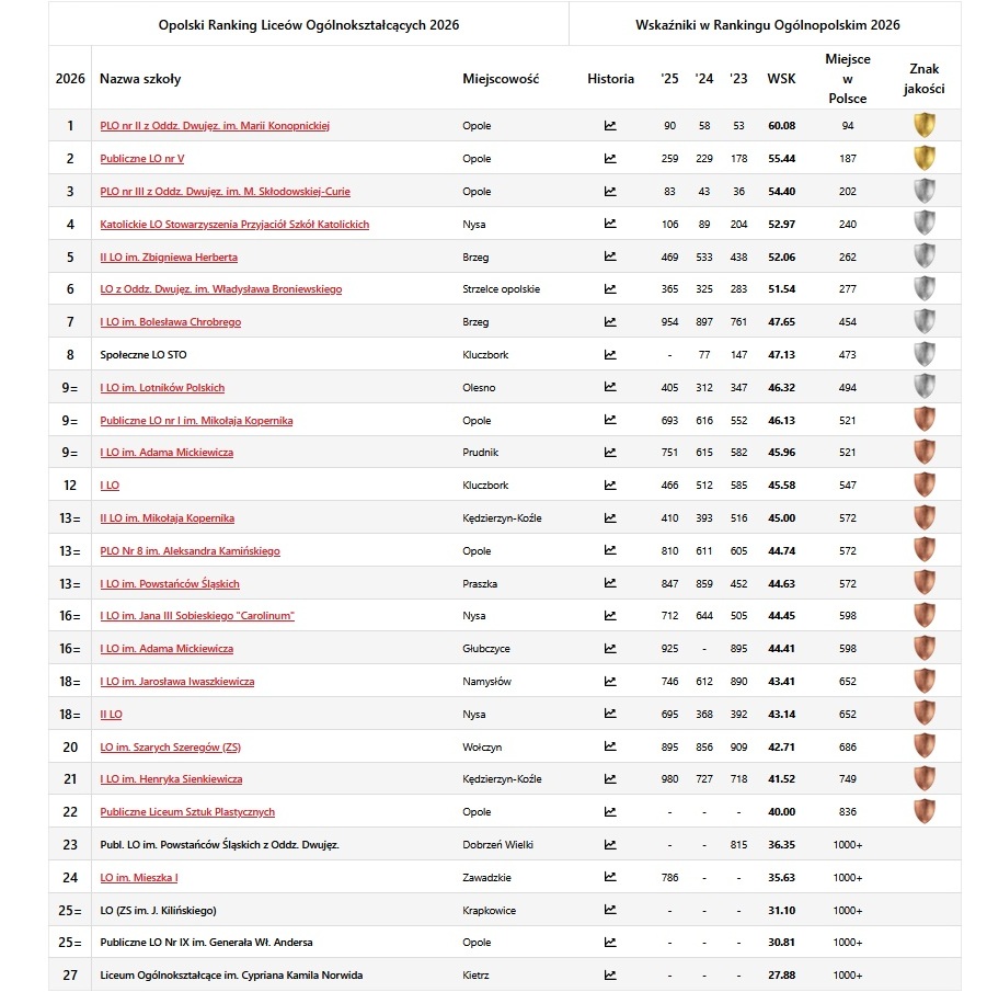 W klasyfikacji liceów na Opolszczyźnie najlepsze okazało się PLO nr 2 dwujęzyczne im. Marii Konopnickiej w Opolu (94. w Polsce). Drugie miejsce zajęło PLO nr 5 w Opolu (187. w Polsce), a trzecie PLO nr 3 dwujęzyczne im. Skłodowskiej-Curie w Opolu (202. w Polsce).