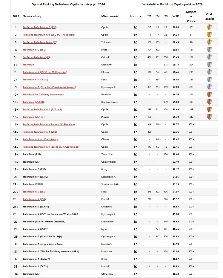 Ranking najlepszych techników na Opolszczyźnie otwiera Publiczne Technikum nr 3 w Zespole Szkół Elektrycznych w Opolu (17. w Polsce). Druga pozycja dla Publicznego Technikum nr 5 z Zespołu Szkół Ekonomicznych w Opolu (51. w Polsce). Miejsce na podium uzupełnia Publiczne Technikum Leśne w Tułowicach (78. w Polsce).