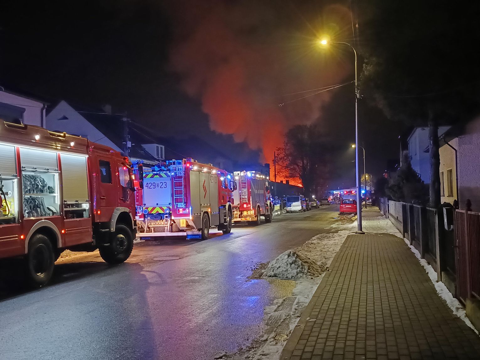 Kierujący działaniami ratowniczymi stwierdził pożar w pełni rozwinięty dwóch przyległych do siebie pustostanów. Pierwszy z budynków miał wymiary 25 × 12 metrów, a drugi 4 × 6 metrów. Ogień obejmował obiekty w całości, a dodatkowo zagrożone były sąsiadujące budynki jednorodzinne. W związku z rozwojem sytuacji na miejsce zadysponowano kolejne siły i środki. Łącznie w akcji uczestniczyło 11 zastępów straży pożarnej, w tym zastępy z Jednostek Ratowniczo-Gaśniczych nr 1 i 2 w Kędzierzynie-Koźlu, jednostki OSP z Cisowej, Sławięcic, Miejsca Kłodnickiego i Kłodnicy oraz drabina z JRG nr 2 z Koźla. Na miejscu obecny był także patrol policji.