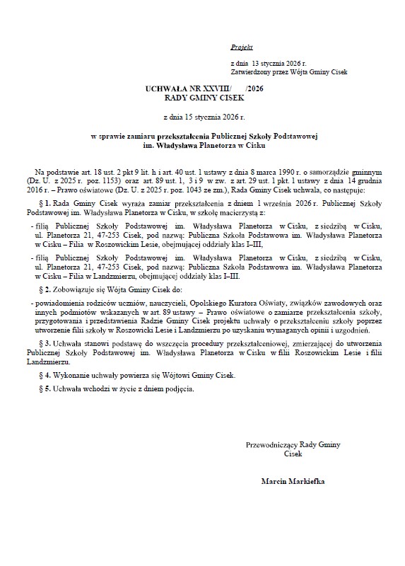 Proces reorganizacji nie kończy się na dwóch placówkach. Na 15 stycznia 2026 r. zwołano kolejną, XXVIII sesję Rady Gminy Cisek. W porządku obrad znalazł się jeden punkt: podjęcie uchwały w sprawie zamiaru przekształcenia Publicznej Szkoły Podstawowej im. Władysława Planetorza w Cisku.