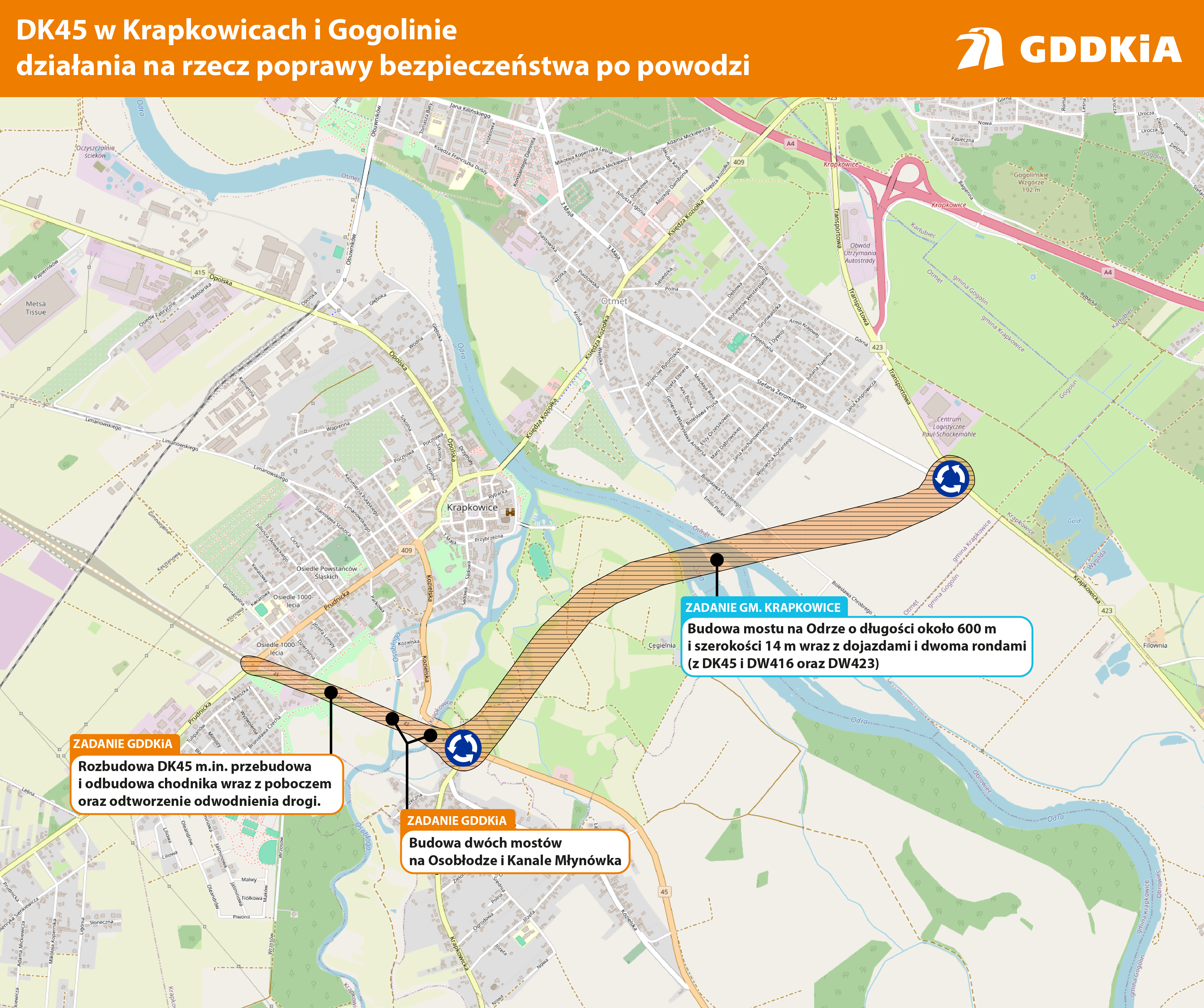 Zadanie realizowane przez GDDKiA obejmuje rozbudowę DK45 w Krapkowicach. Wykonawca w pierwszej kolejności przygotuje projekt budowlany i wystąpi do Wojewody Opolskiego o pozwolenie na budowę (tj. decyzję o zezwoleniu na realizację inwestycji drogowej - ZRID).