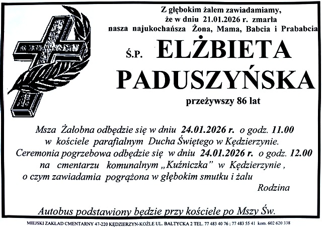 Msza żałobna odbędzie się w najbliższą sobotę (24 stycznia) o godz. 11.00 w kościele parafialnym p.w. Ducha Świętego w Kędzierzynie.