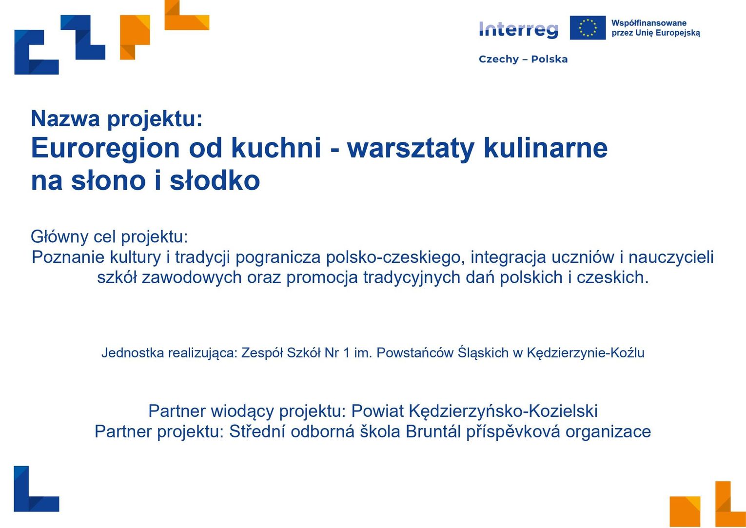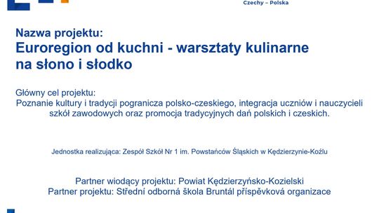 Projekt „Euroregion od kuchni” współfinansowany jest z Funduszu Małych Projektów w Euroregionie Pradziad i realizowany ze środków programu Interreg Czechy–Polska 2021–2027, w ramach Priorytetu 4 – Współpraca instytucji i mieszkańców oraz celu 4.2 – pogłębianie więzi transgranicznych mieszkańców i instytucji pogranicza czesko-polskiego.