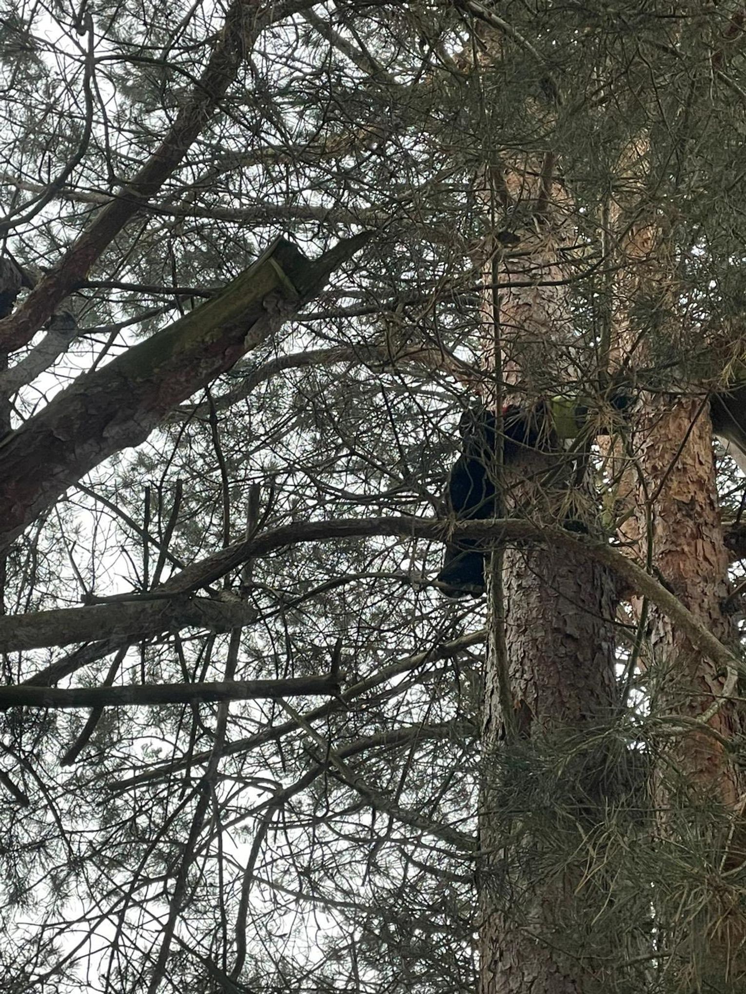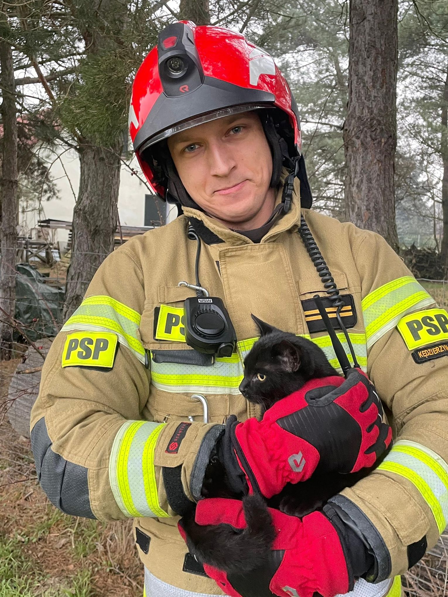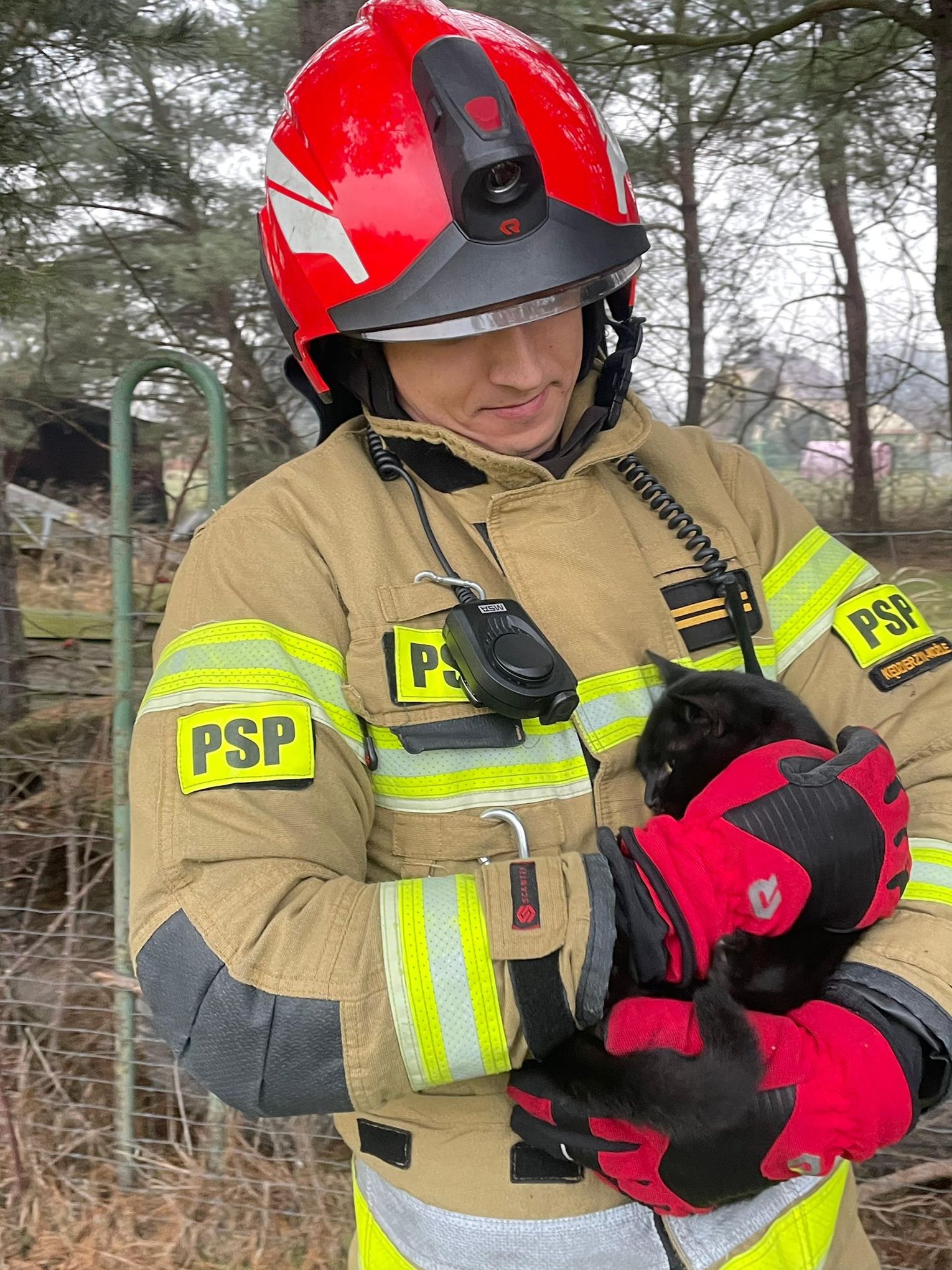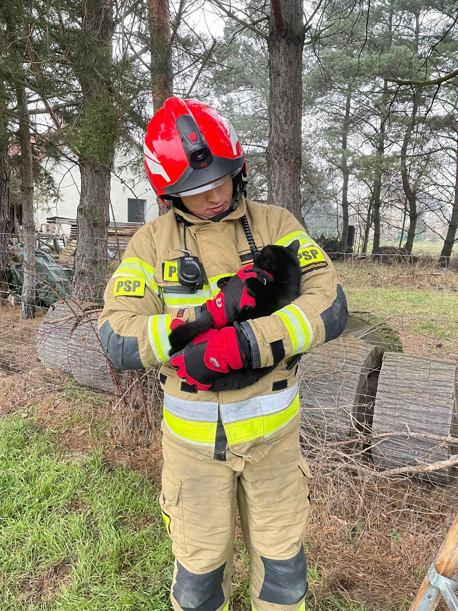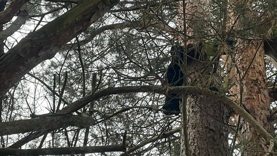 Po dotarciu na miejsce potwierdzono treść zgłoszenia i niezwłocznie przystąpiono do działań. Przy użyciu drabiny nasadkowej oraz sprzętu ratownictwa wysokościowego zwierzę zostało bezpiecznie ewakuowane z wysokości około 4 metrów i przekazane w ręce właściciela.