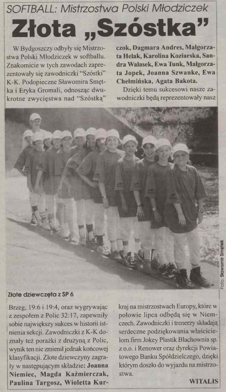 Podopieczne Sławomira Smętka i Eryka Gromali, odnosząc dwukrotne zwycięstwa nad “Szóstką” Brzeg, 19:6 i 19:4, oraz wygrywając i z zespołem z Polic 32:17, zapewniły i sobie największy sukces w historii istnienia sekcji. Zawodniczki z K-K doznały też porażki z drużyną z Polic, wynik ten nie zmienił jednak końcowej klasyfikacji. Złote dziewczyny zagrały w następującym składzie: Joanna Niemiec, Magda Kaźmierczak, Paulina Targosz, Wioletta Kurczok, Dagmara Andres, Małgorzata Helak, Karolina Koziarska, Sandra Walasek, Ewa Tunk, Małgorzata Jopek, Joanna Szwanke, Ewa Chełmińska, Agata Bakota. Dzięki temu sukcesowi nasze zawodniczki będą reprezentowały naszkraj na mistrzostwach Europy, które w | połowie lipca odbędą się w Niemczech. Zawodniczki i trenerzy składają serdeczne podziękowania właścicielom firm Jokey Plastik Blachownia Sp. z o.o. i Renower oraz dyrekcji Powiatowego Banku Spółdzielczego, dzięki którym doszło do wyjazdu na mistrzostwa.