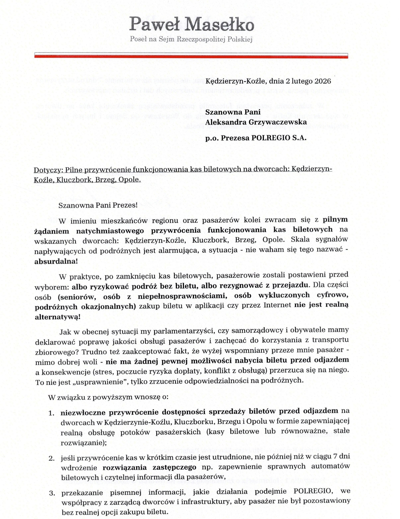 One też mają prawo do normalnej, dostępnej obsługi – a nie być zmuszonym do zakupu przez automatyczny biletomat czy przez aplikację na telefon/Internet w stresie, upokorzeniu i ryzyku, że „jakoś to będzie”. Sam korzystałem z tych kas, kupując w nich bilety na pociągi do Warszawy, Opola czy innych miast, aby tam pełnić swoje obowiązki Posła. Dziś (02.02) podjąłem pilne działania w sprawie przywrócenia działania zamkniętych kas biletowych na dworcach w Kędzierzynie-Koźlu, Kluczborku, Brzegu i Opolu. Wysłałem oficjalne pismo do Prezesa POLREGIO S.A., a także do Ministra Aktywów Państwowych, który sprawuje nadzór nad spółką. Poza tym, w przyszłym tygodniu będąc w Sejmie w Warszawie, osobiście interweniuję w tej sprawie. Będę domagał się konkretnych decyzji i terminu przywrócenia sprzedaży biletów na stacjach - bo tak to dalej wyglądać nie może – czytamy w mediach społecznościowych posła Pawła Masełki.