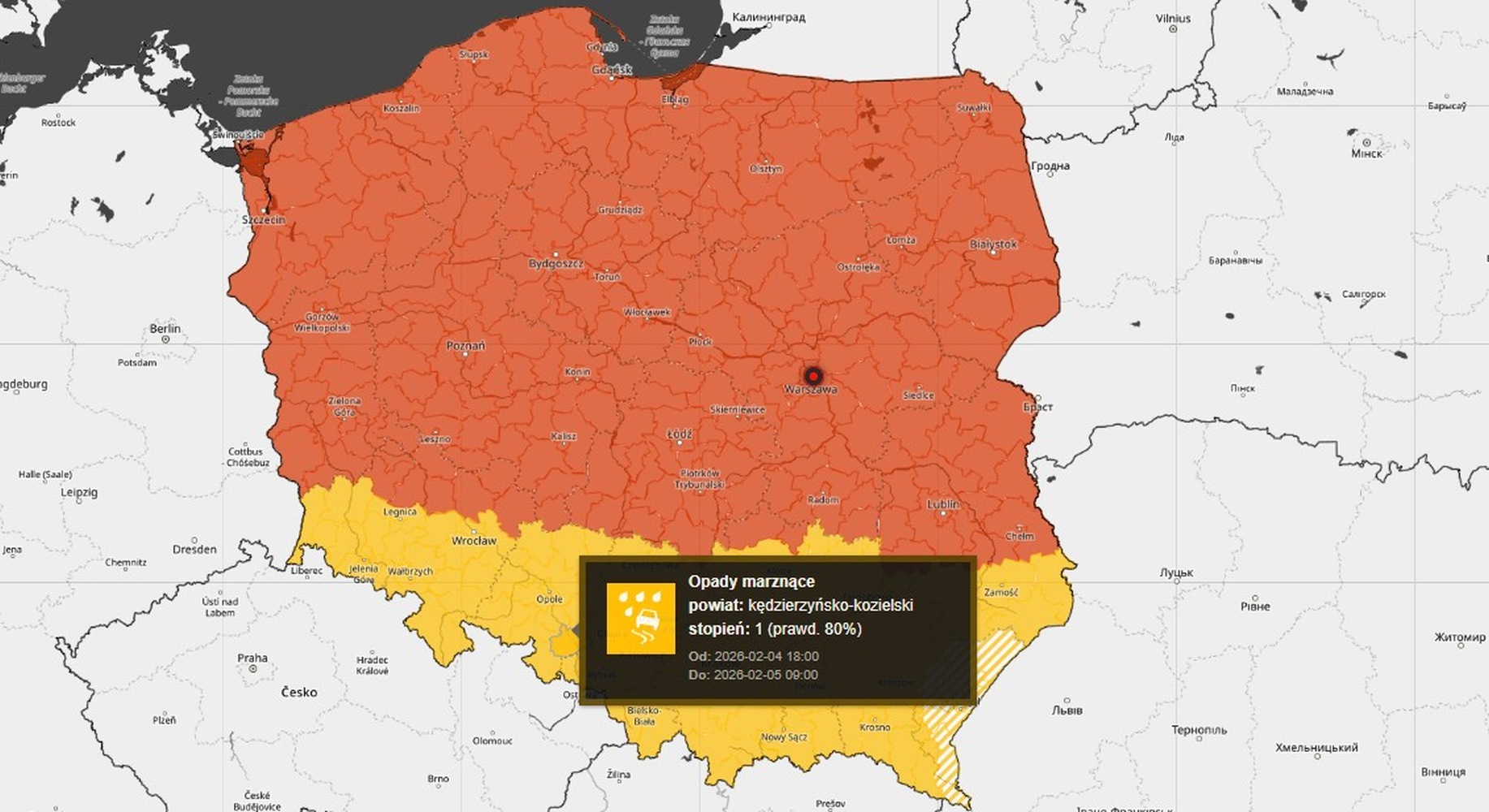 Ostrzeżenie obowiązuje od godz. 18:00 w środę 4 lutego do godz. 09:00 w czwartek 5 lutego.