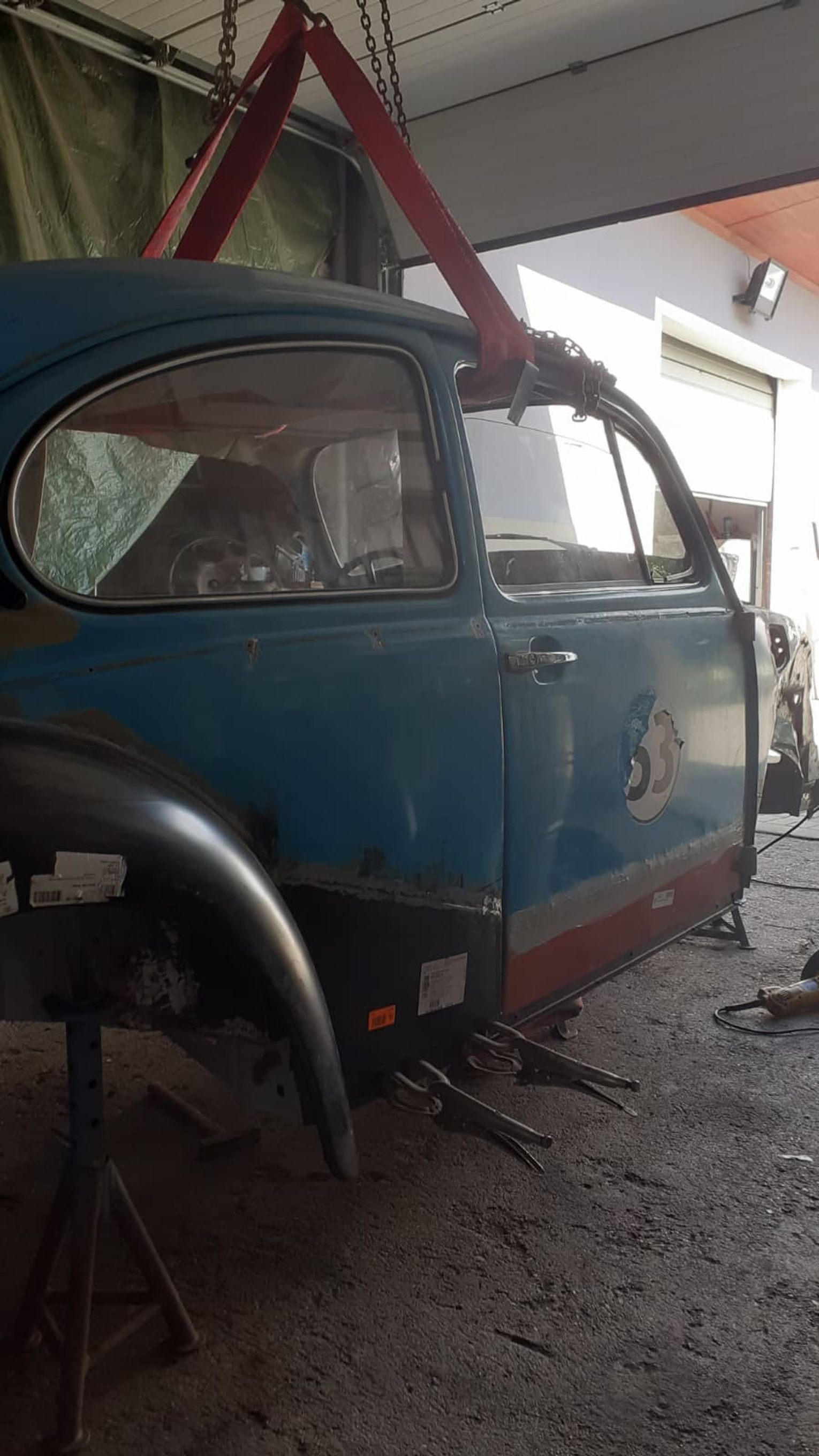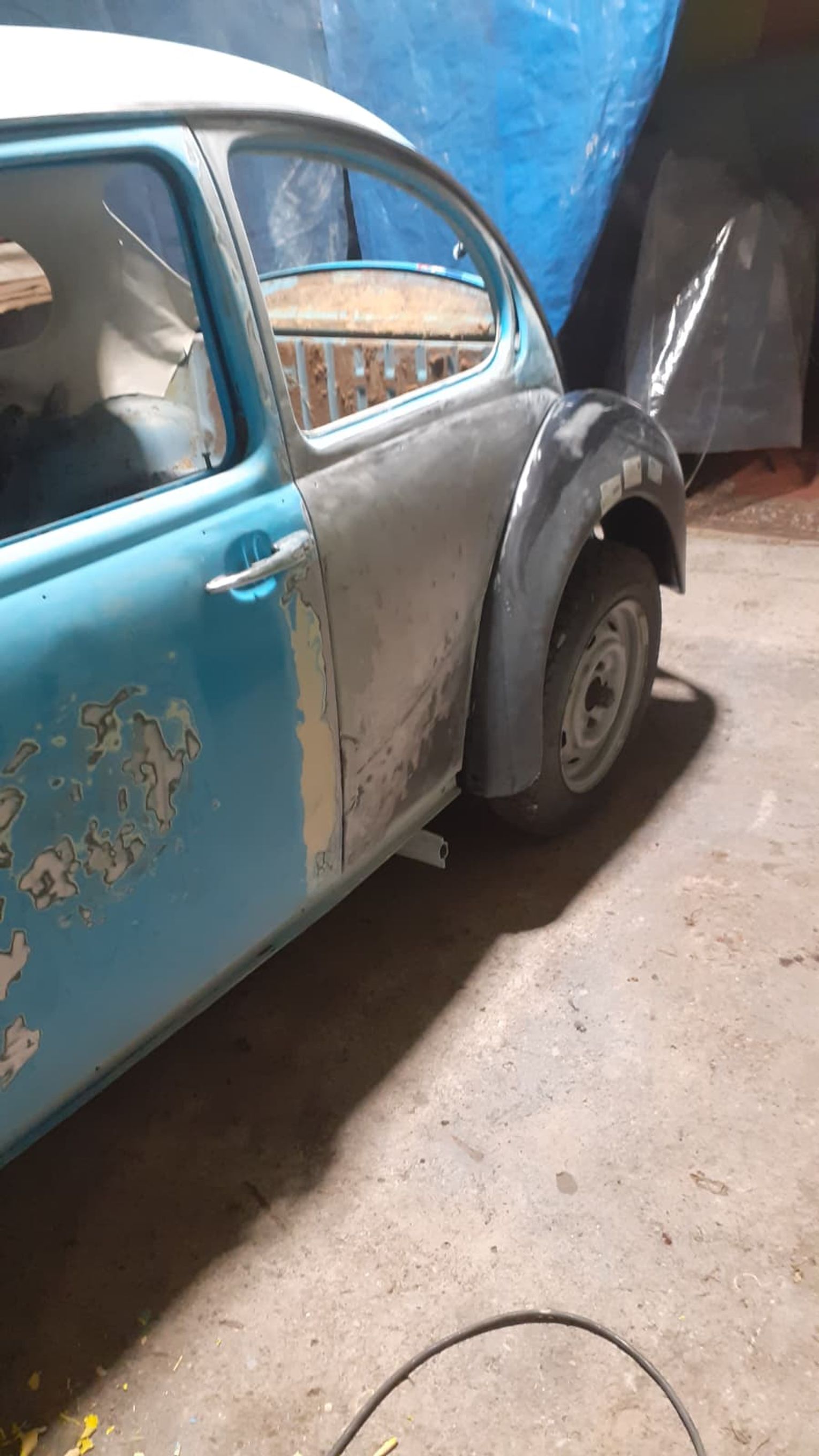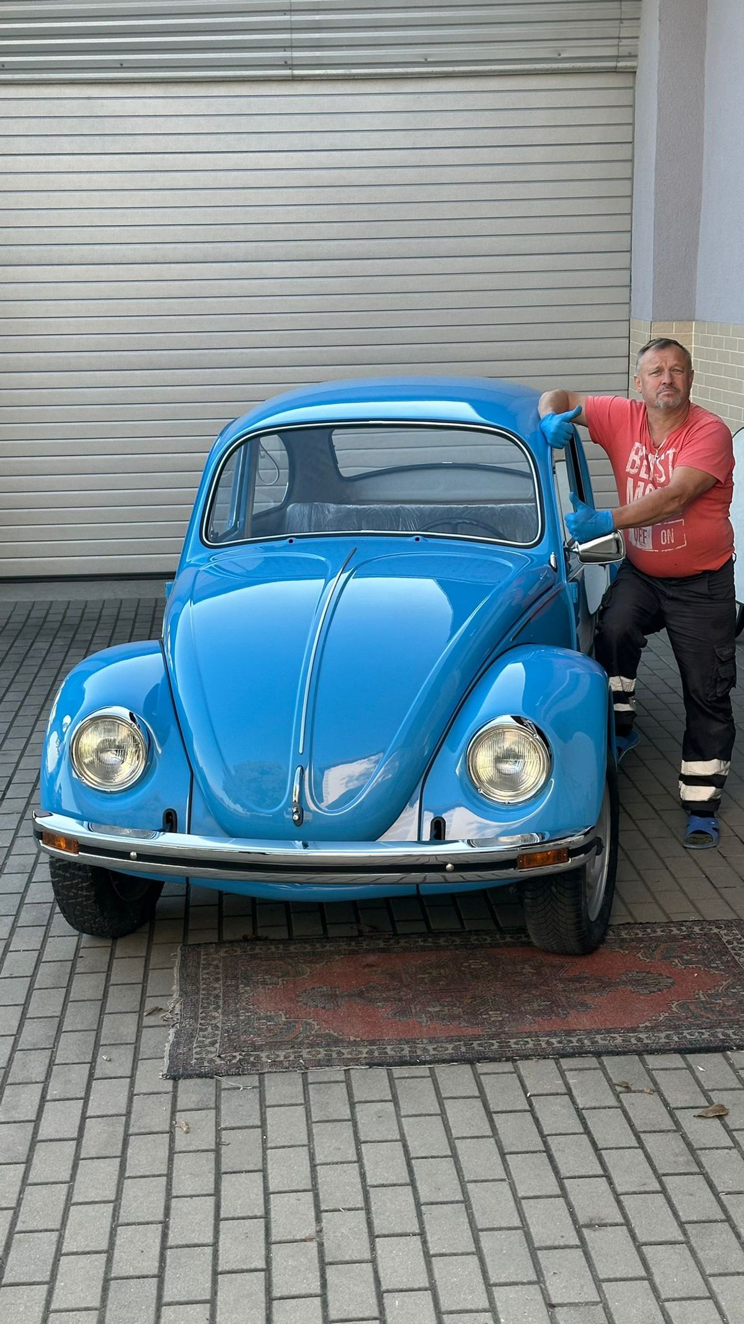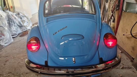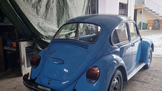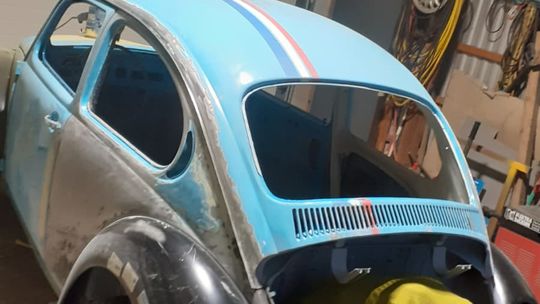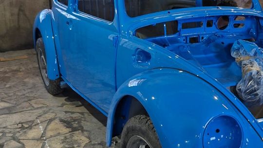 Garbusa rozebrano do gołej ramy. Wymieniono praktycznie całą blacharkę: podłogę wewnętrzną i zewnętrzną, progi, nadkola, błotniki, przednią i tylną klapę. Karoseria została zabezpieczona epoksydem okrętowym, a następnie polakierowana w oryginalnym, fabrycznym odcieniu niebieskiego Volkswagena, dziś nieco żywszym niż po latach blaknięcia.