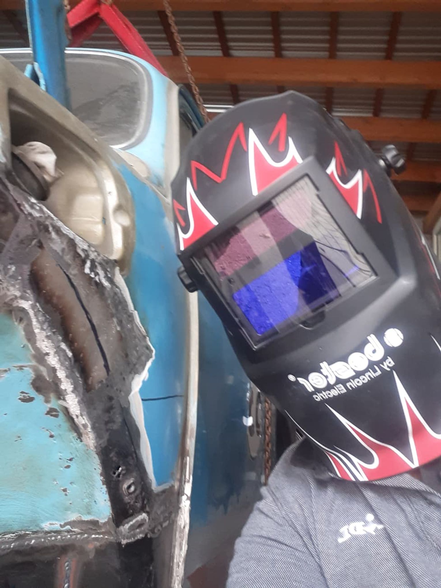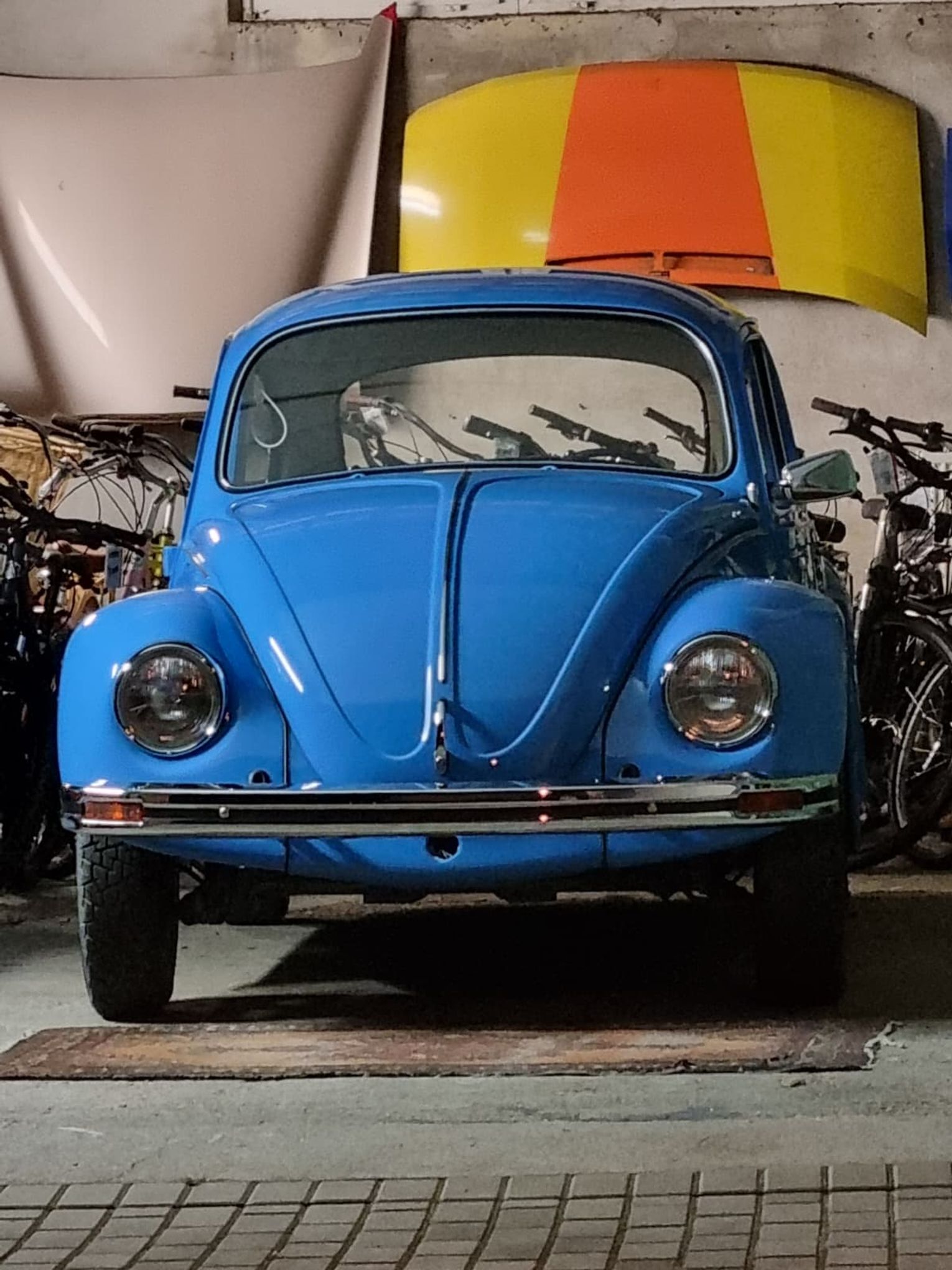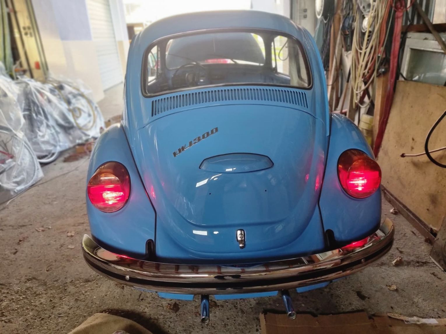 Garbusa rozebrano do gołej ramy. Wymieniono praktycznie całą blacharkę: podłogę wewnętrzną i zewnętrzną, progi, nadkola, błotniki, przednią i tylną klapę. Karoseria została zabezpieczona epoksydem okrętowym, a następnie polakierowana w oryginalnym, fabrycznym odcieniu niebieskiego Volkswagena, dziś nieco żywszym niż po latach blaknięcia.