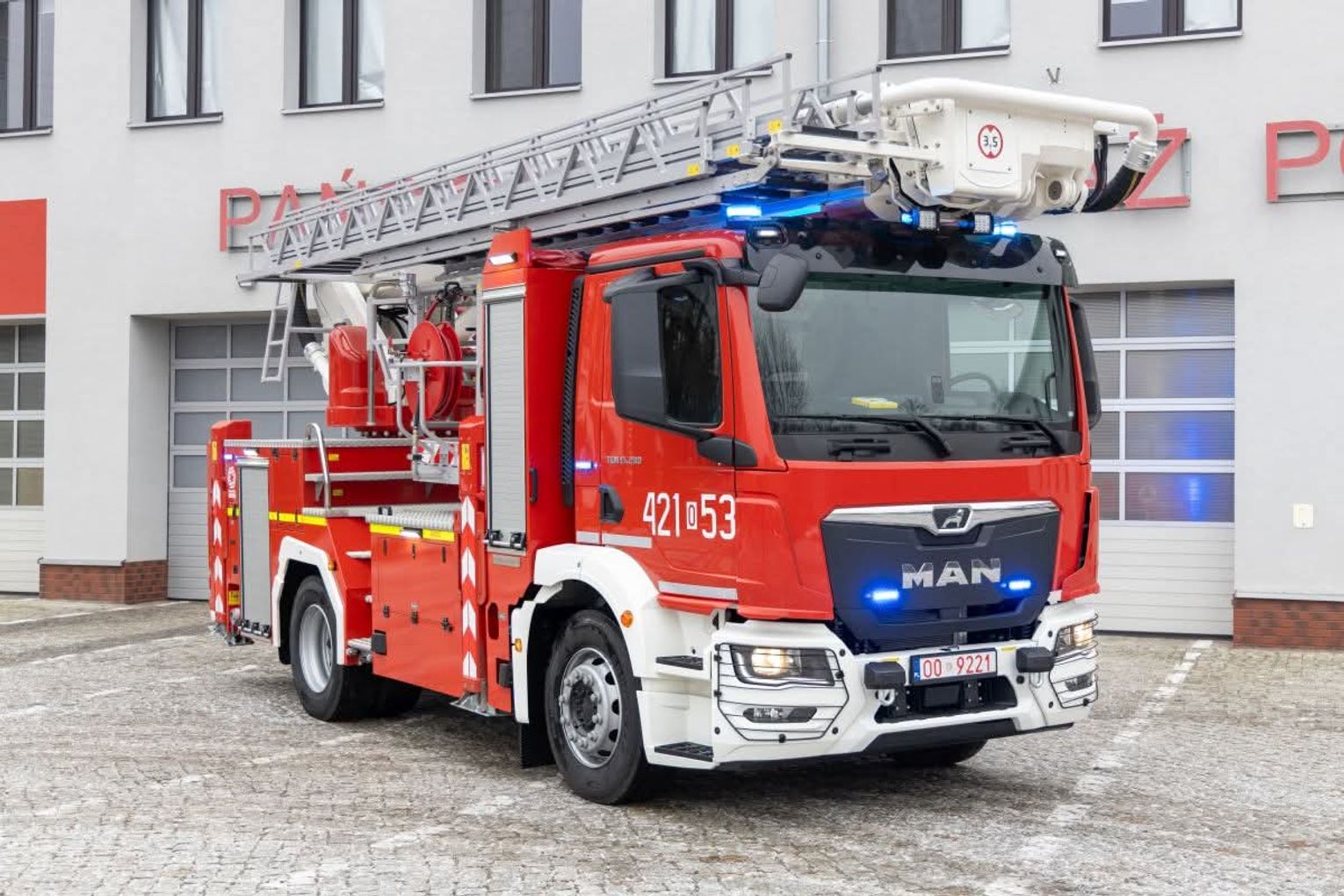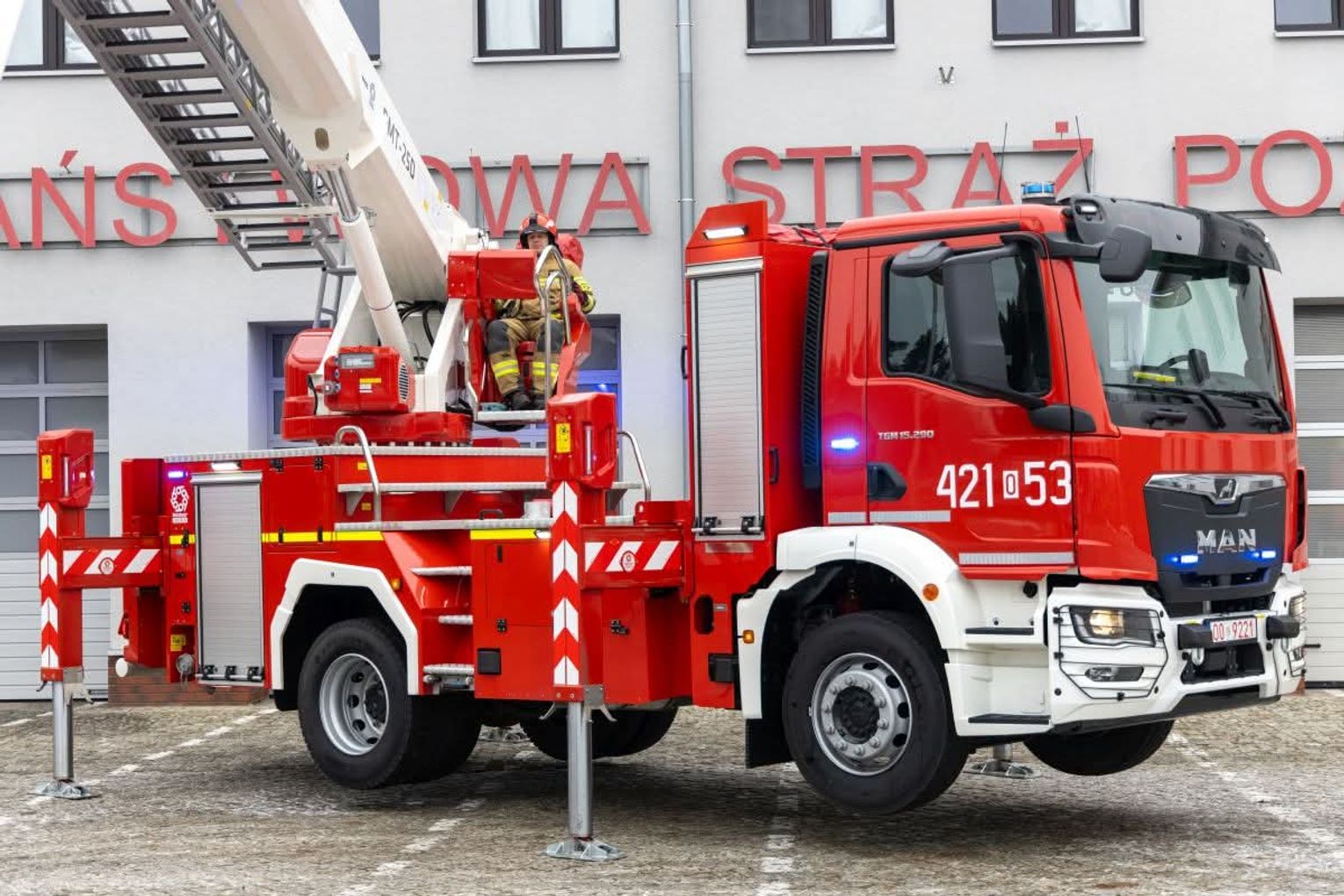 Podnośnik hydrauliczny typu PMT-25 D.14 zabudowany na podwoziu MAN TGM 15.290 4x2 BN o wysokości ratowniczej minimum 23 metry zabudowany został przez firmę Bumar Koszalin.