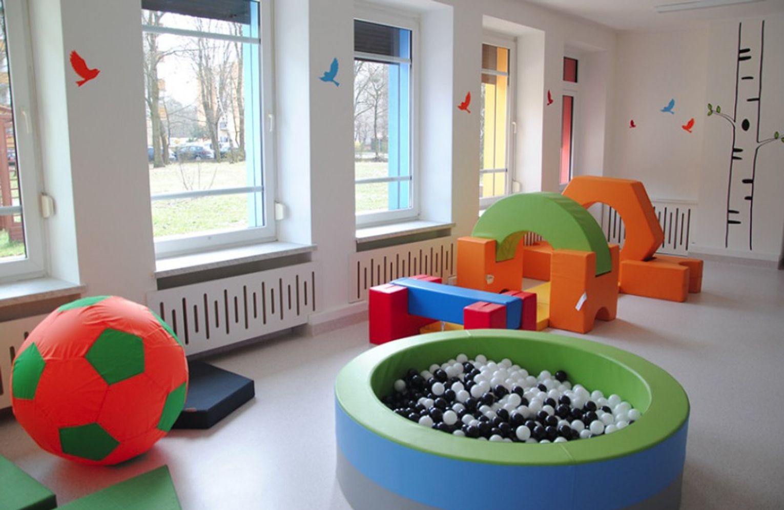 Obecnie żłobek dysponuje trzema wyodrębnionymi przestrzeniami przeznaczonymi do ruchu, zabawy i gimnastyki. Codzienna aktywność fizyczna wspiera rozwój motoryczny, koordynację oraz samodzielność dzieci. Świadomie dobrałam kolorystykę całej przestrzeni, uwzględniając potrzebę wyciszenia i ograniczenia nadmiernej stymulacji.