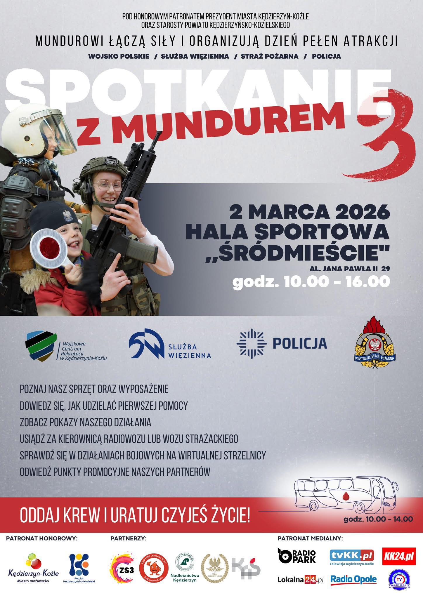 Wydarzenie pt. „Spotkanie z mundurem 3” będzie okazją do zapoznania się z tajnikami pracy osób, które na co dzień dbają o nasze bezpieczeństwo. I tym razem w godzinach od 10:00 do 16:00 w Hali Sportowej „Śródmieście”, przy al. Jana Pawła II 29 przygotowano mnóstwo atrakcji - zarówno dla dzieci, młodzieży, jak i dorosłych!