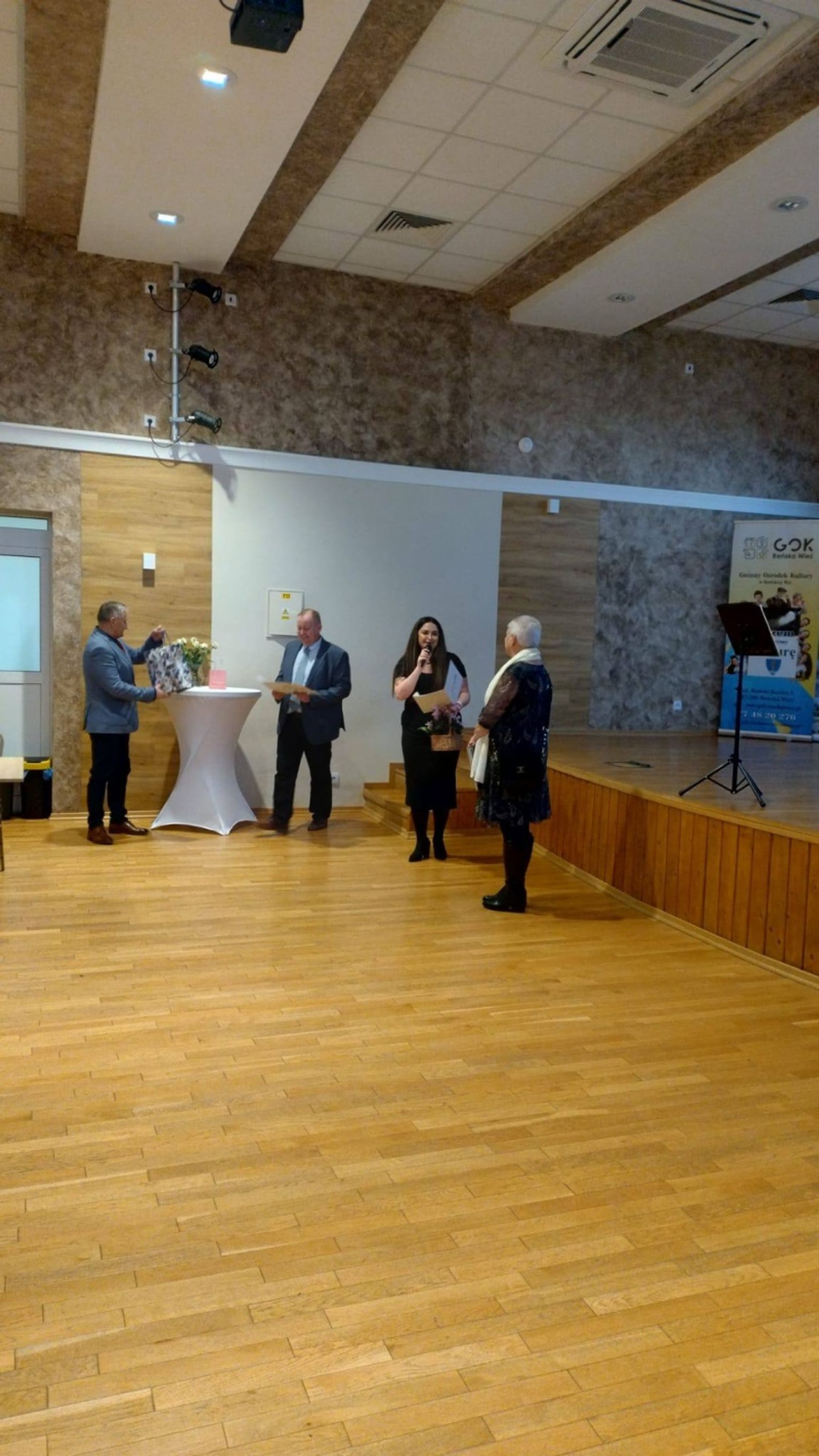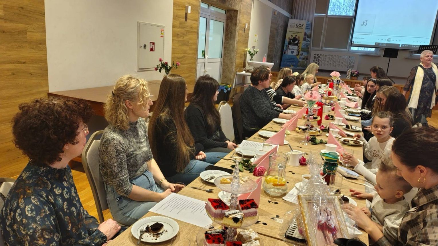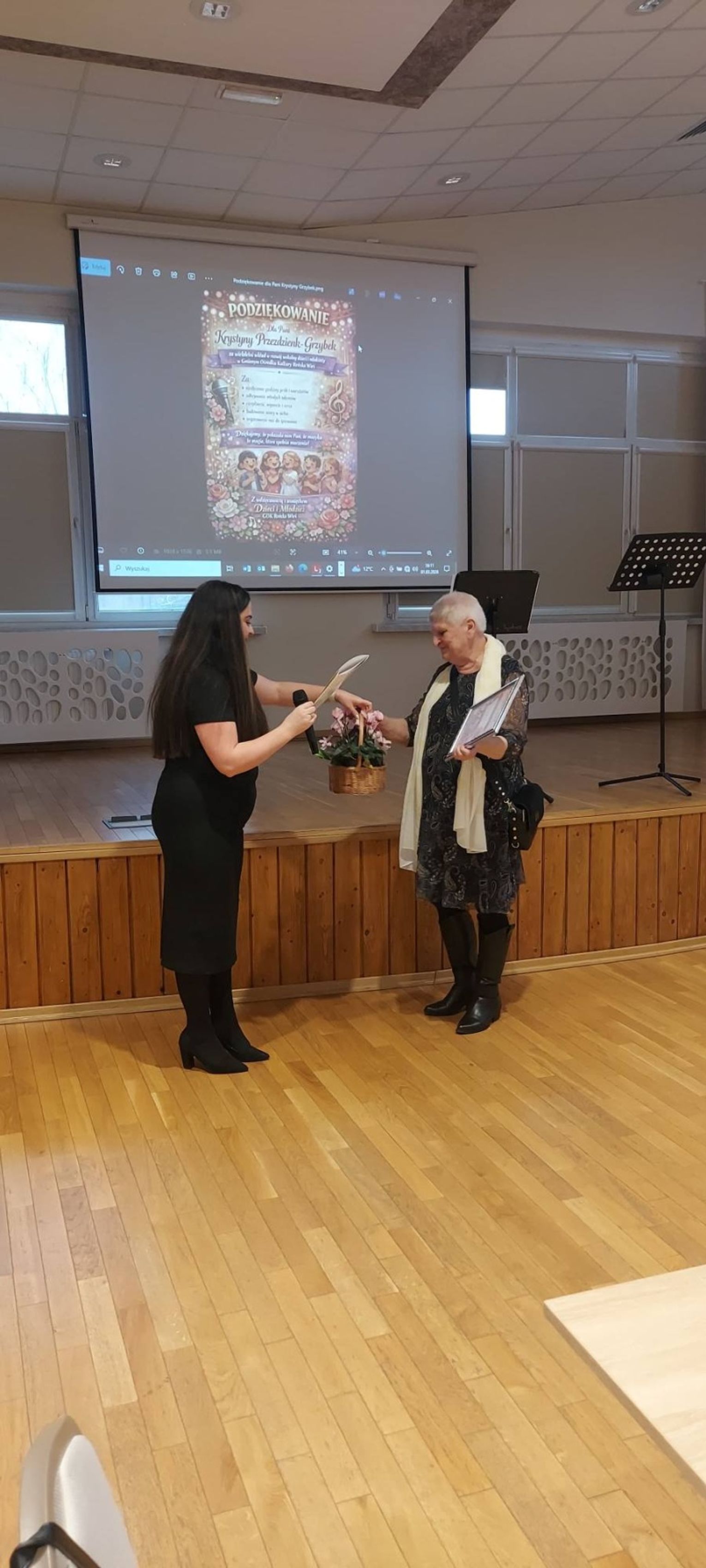 W sali widowiskowej GOK-u zebrały się osoby, które przez lata tworzyły wokalne środowisko gminy. To właśnie one – z inicjatywy rodziców młodych wokalistów oraz przy wsparciu Waldemara i Sylwii Semmlerów – przygotowały dla Krystyny Przezdzienk‑Grzybek niezwykłą niespodziankę. Spotkanie stało się okazją do wspólnego świętowania, ale przede wszystkim do wyrażenia wdzięczności za jej ogromny wkład w życie kulturalne Reńskiej Wsi.