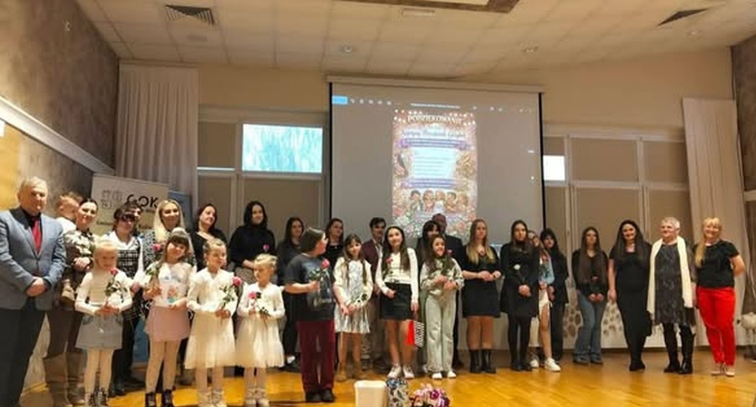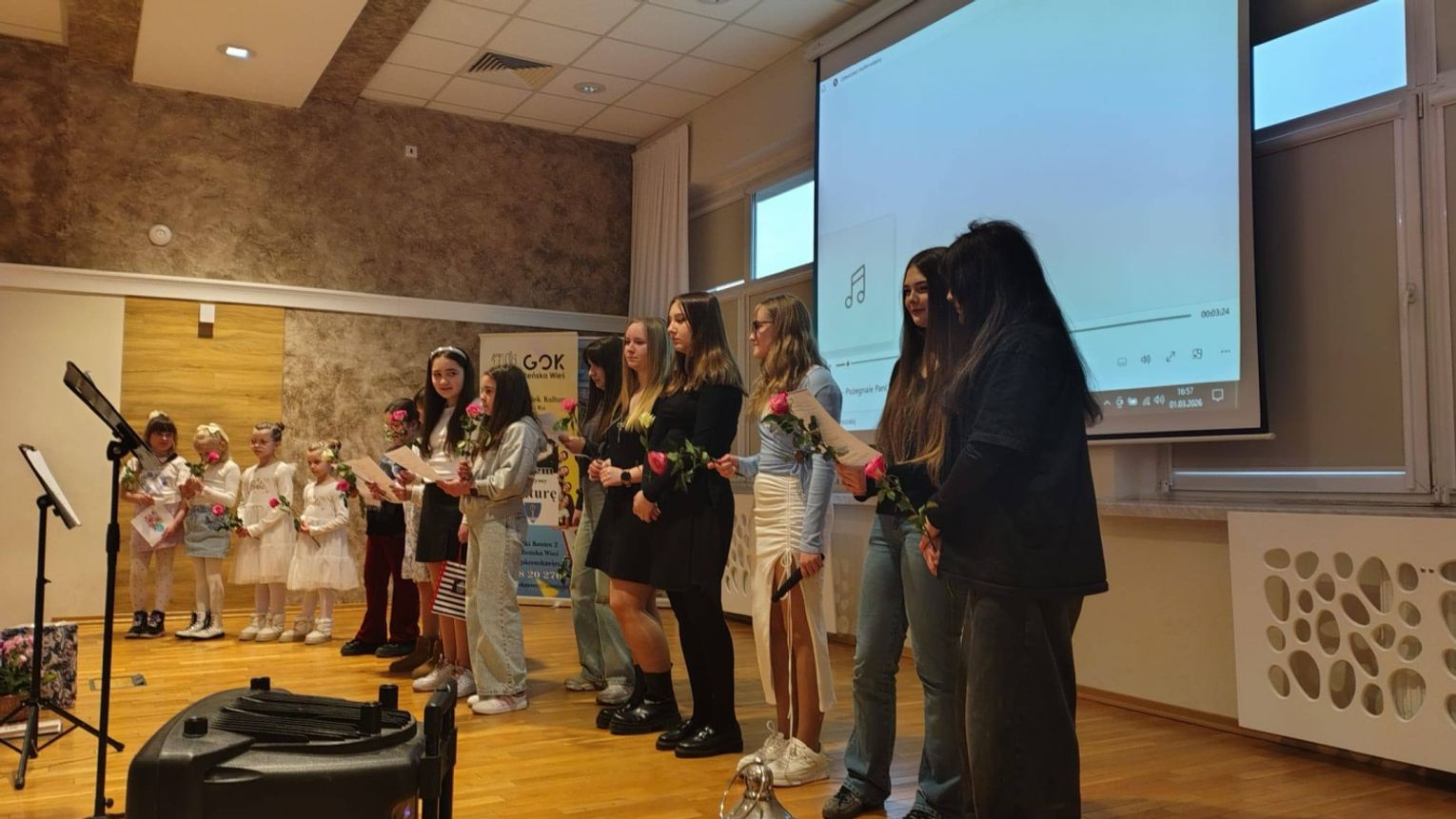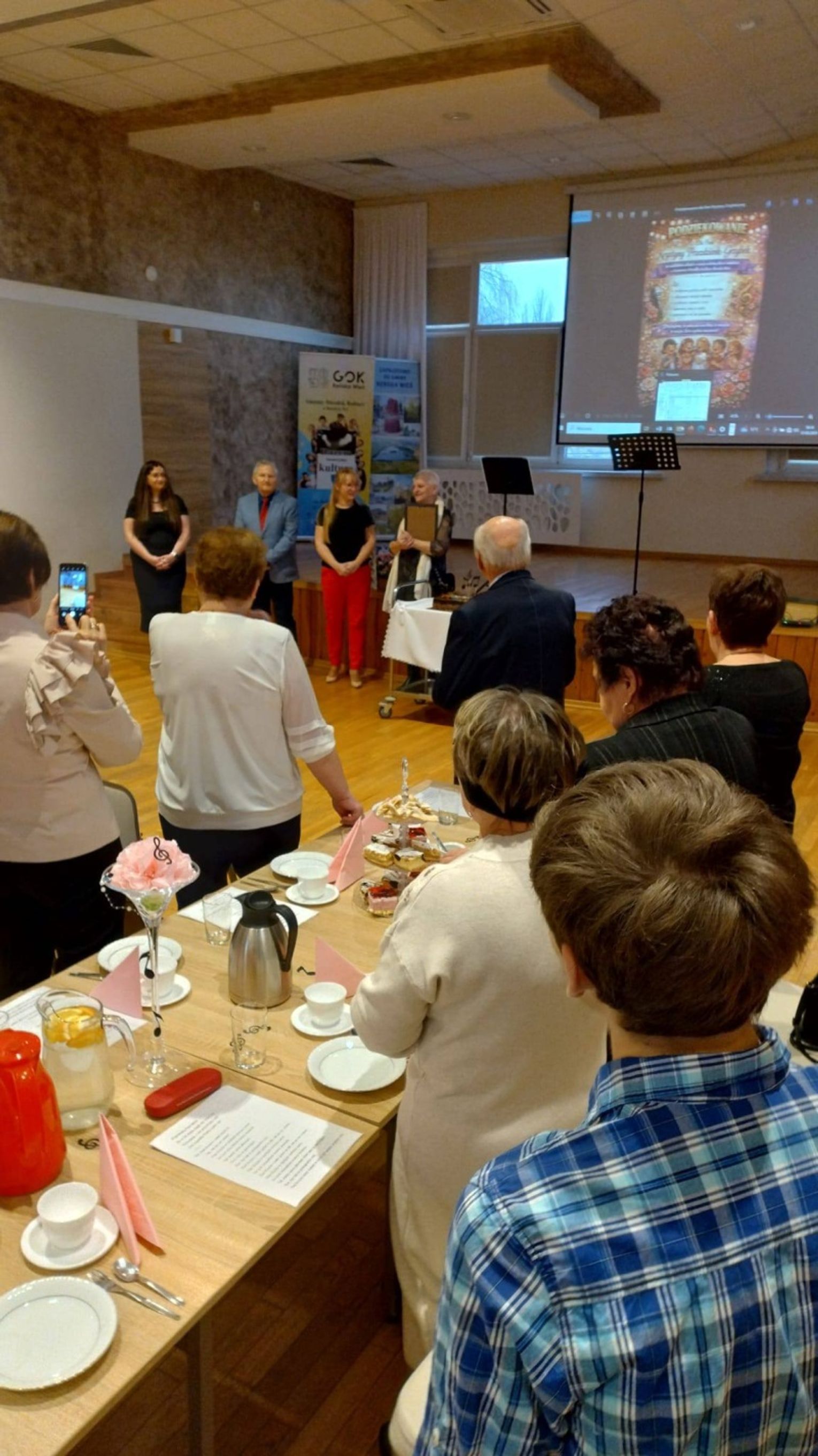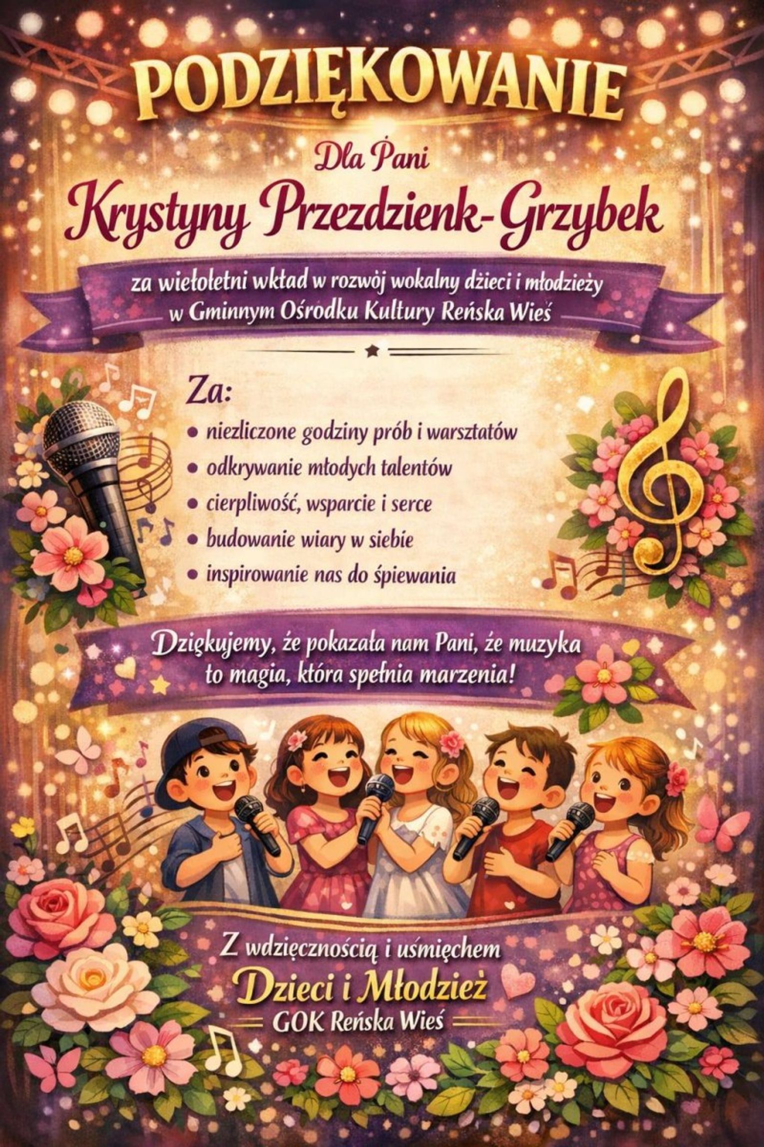 W sali widowiskowej GOK-u zebrały się osoby, które przez lata tworzyły wokalne środowisko gminy. To właśnie one – z inicjatywy rodziców młodych wokalistów oraz przy wsparciu Waldemara i Sylwii Semmlerów – przygotowały dla Krystyny Przezdzienk‑Grzybek niezwykłą niespodziankę. Spotkanie stało się okazją do wspólnego świętowania, ale przede wszystkim do wyrażenia wdzięczności za jej ogromny wkład w życie kulturalne Reńskiej Wsi.