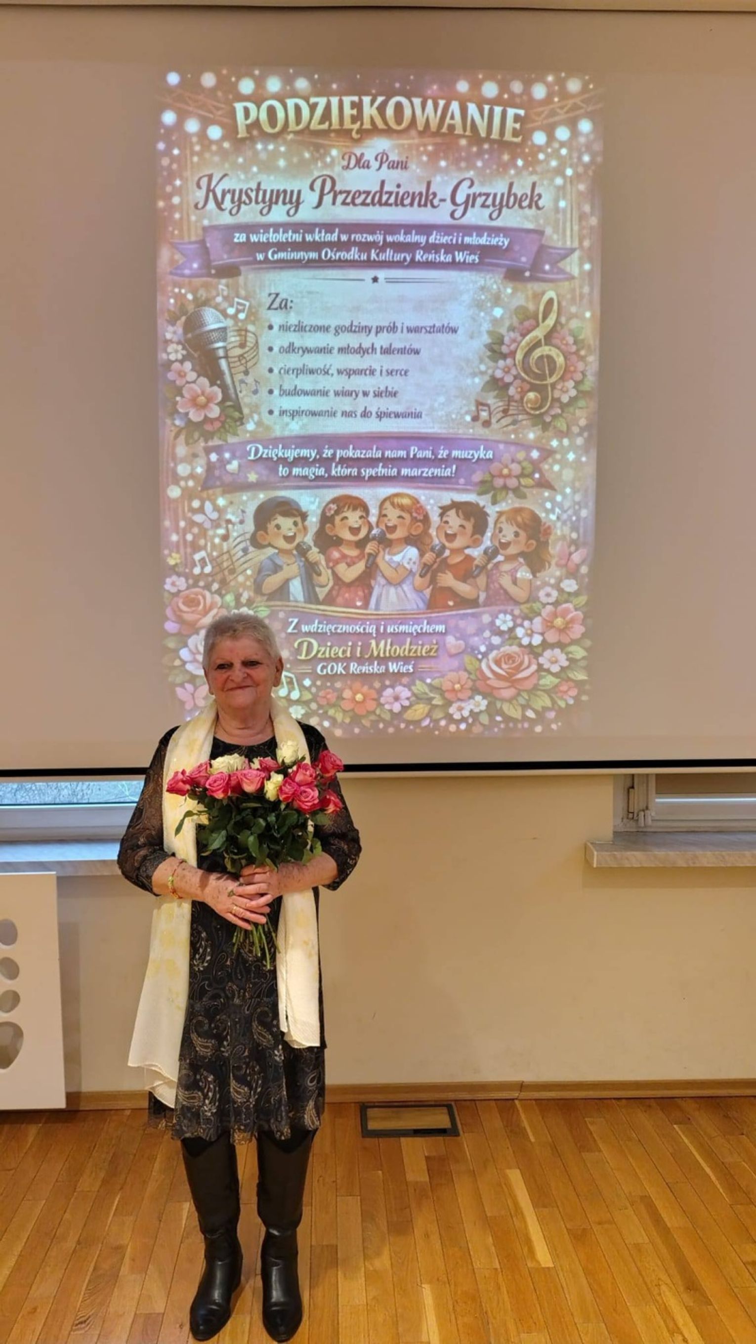 Przez niemal 20 lat pani Krystyna prowadziła zespoły wokalne, ucząc kolejne pokolenia nie tylko śpiewu, lecz także wrażliwości, odwagi i wiary w siebie. Dla wielu była kimś więcej niż instruktorką – przewodniczką, mentorką i osobą, która potrafiła dostrzec talent tam, gdzie inni widzieli tylko nieśmiałość.